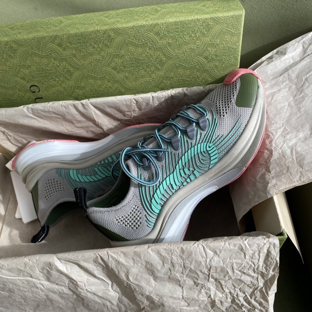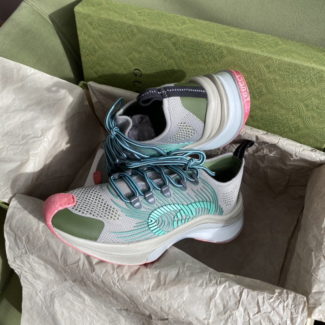 运动风格的设计通过具有强烈徽标存在的 Gucci 棱镜进行诠释。这双标志性运动鞋采用交织字母科技针织面料剪裁而成,饰有经典 GG 图案。双色调鞋底以有趣的色彩对比完善了风格