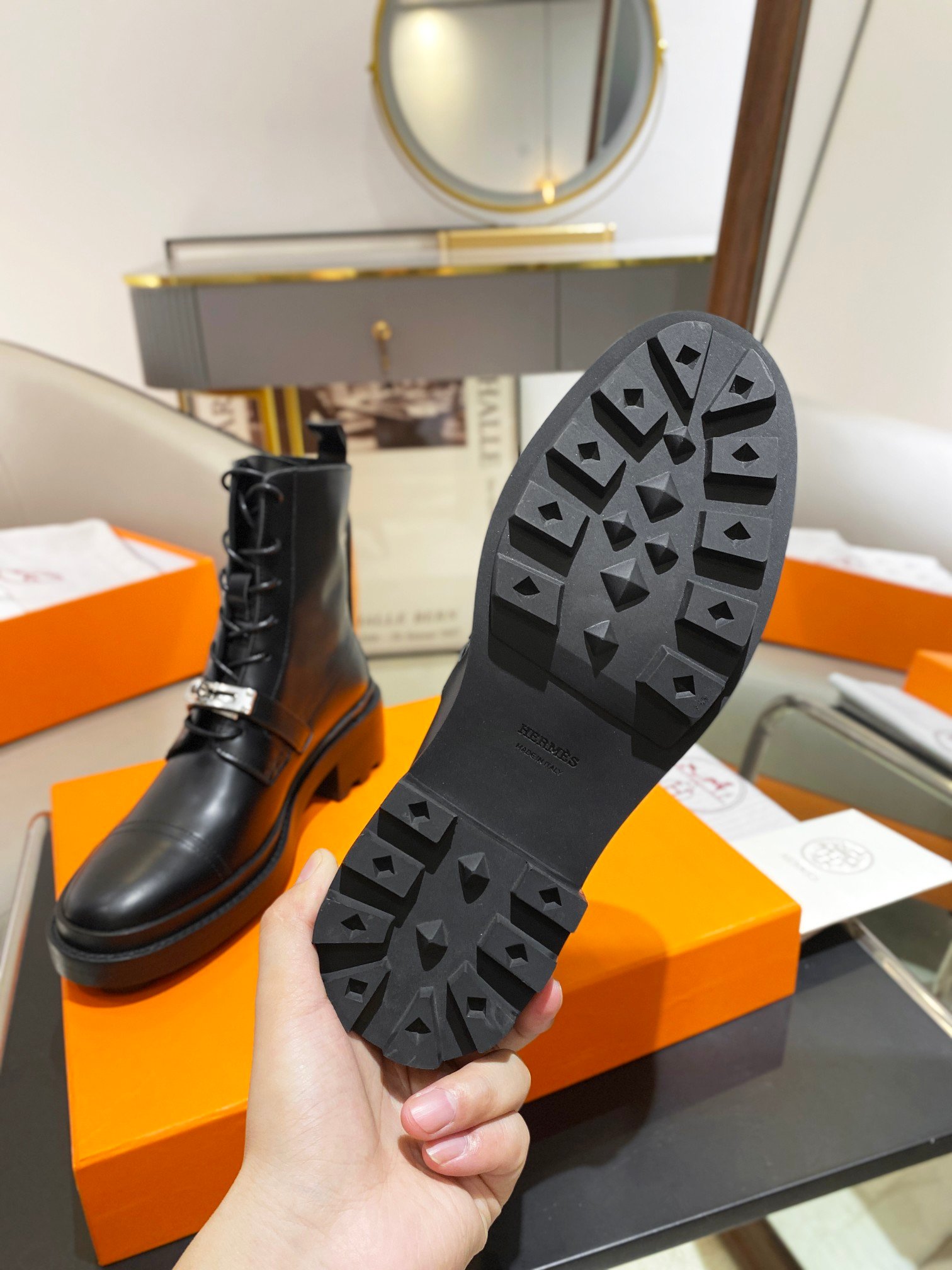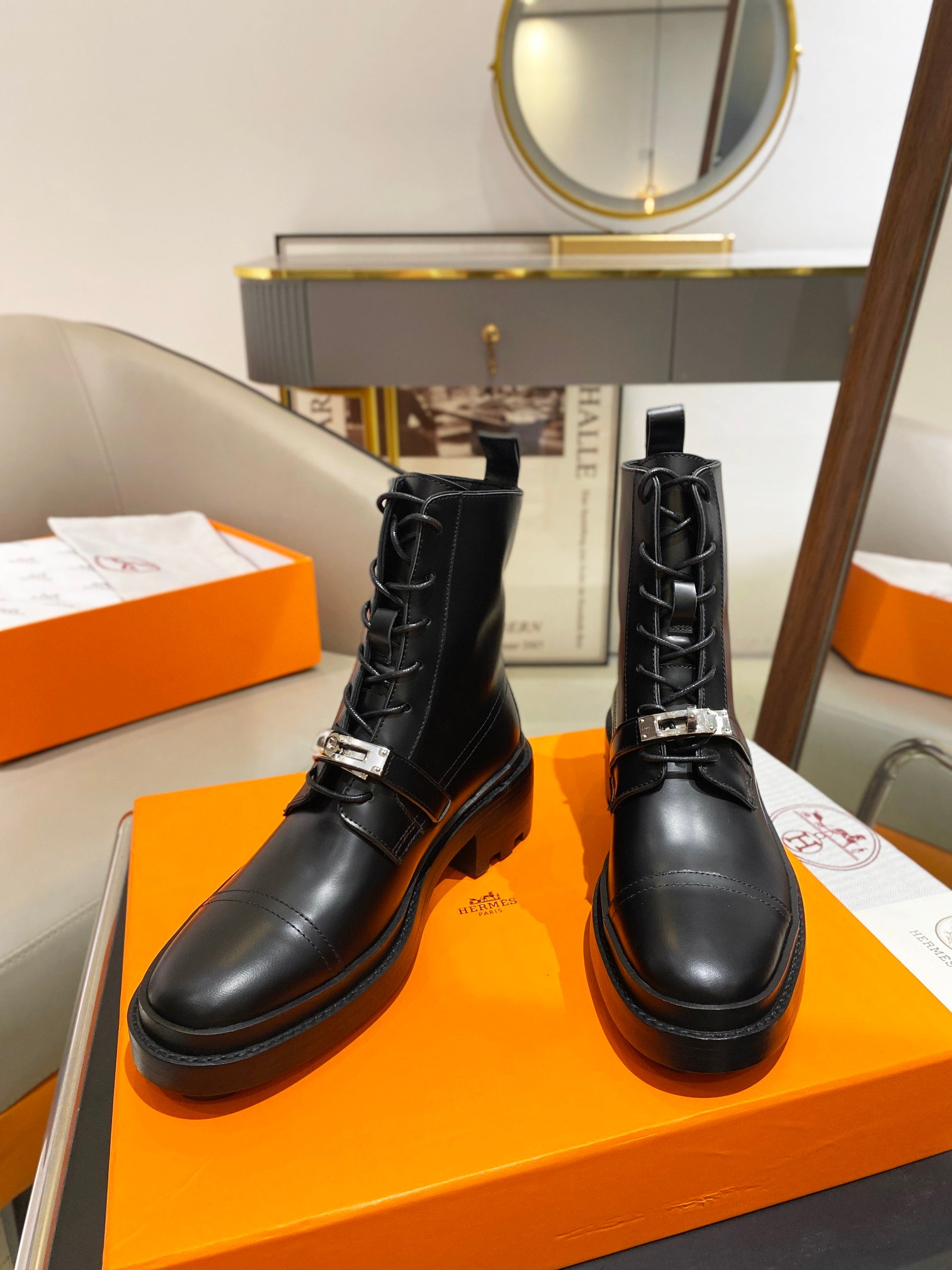 高帮靴,配有功能性镀钯凯莉扣。