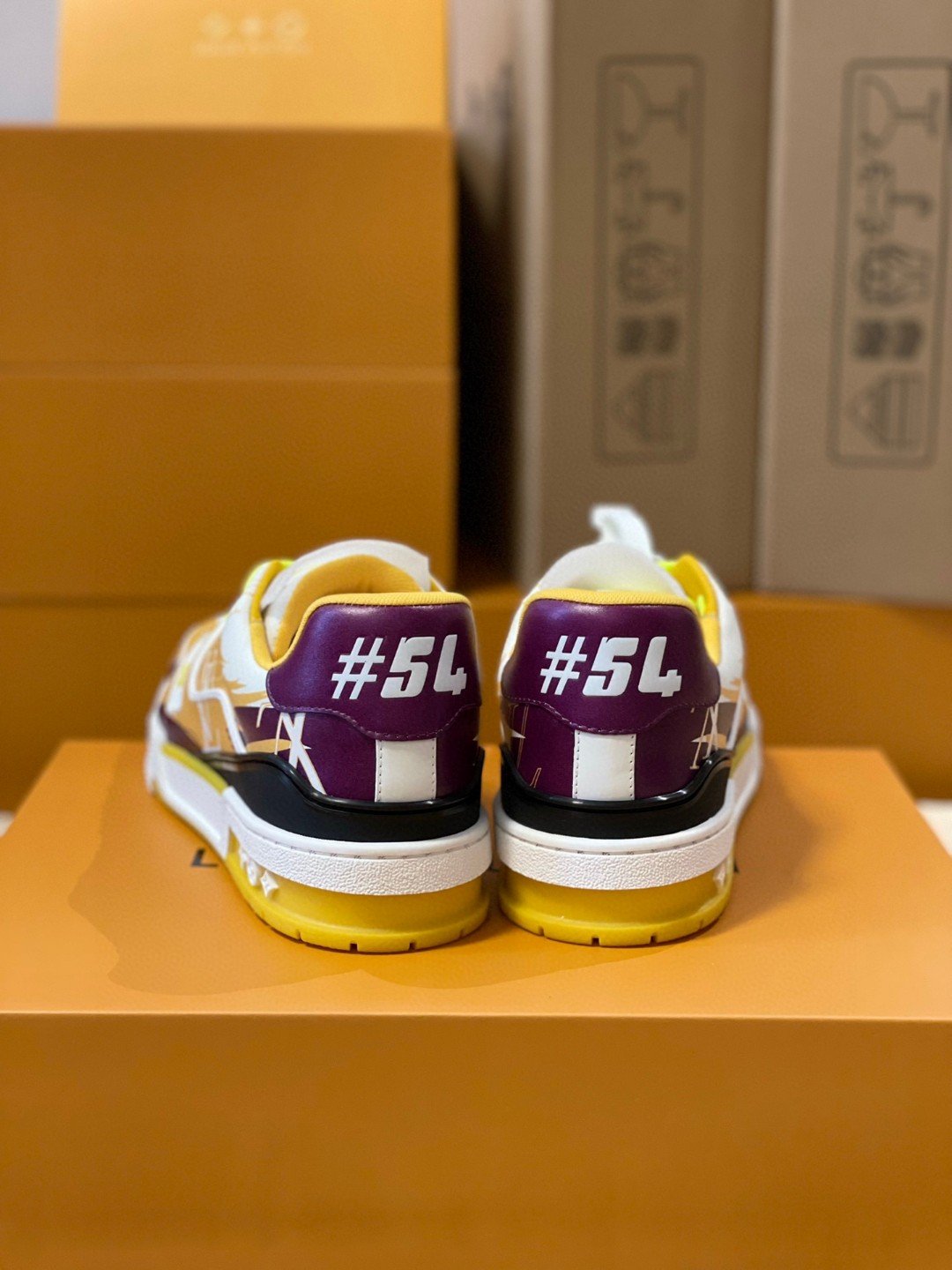 标志性的 LV Trainer 运动鞋以 Virgil Abloh 创作的印花图案重新演绎。图案鞋面搭配饰有 Monogram Flowers 的双色橡胶外底。该鞋款的鞋舌和侧面印有 LV 首字母,后背印有 #54 签名,代表 1854 年,即路易威登创立的年份。