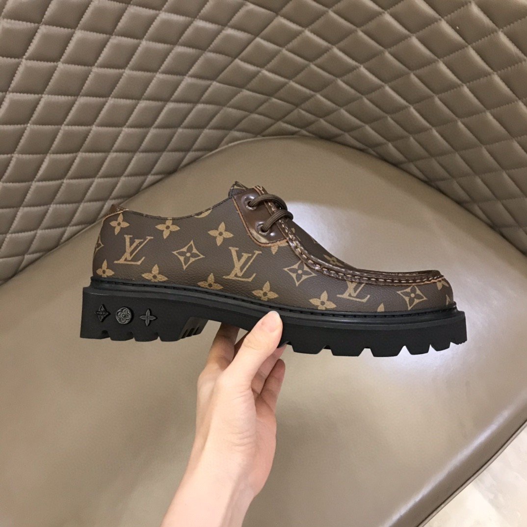 LV Ranger 德比鞋采用光滑的鞋面,鞋面饰有 Monogram 压纹。该鞋款以其厚实的超轻微型纹理外底而闻名,赋予其轻松而时尚的外观。厚实的织物鞋带和外底上的三个 Monogram 花朵完成了此设计。