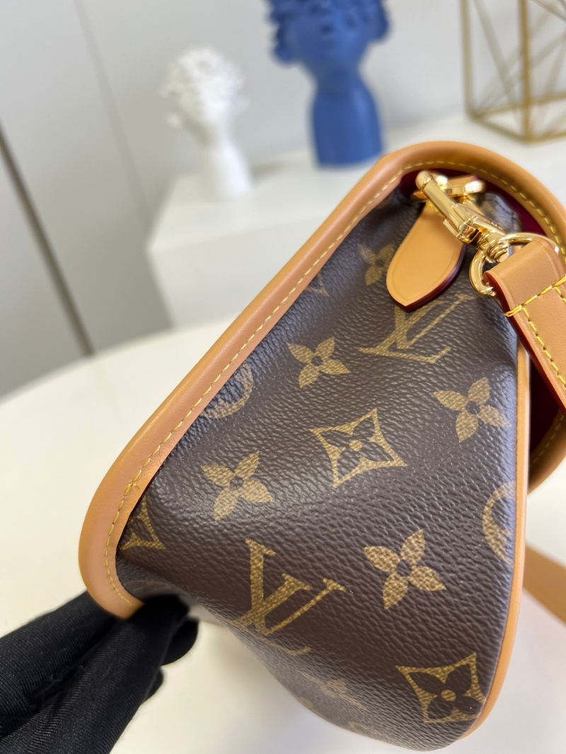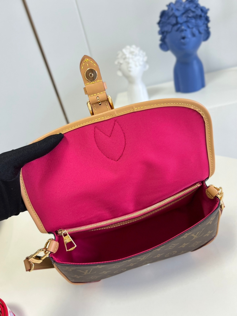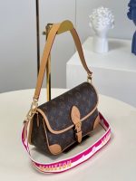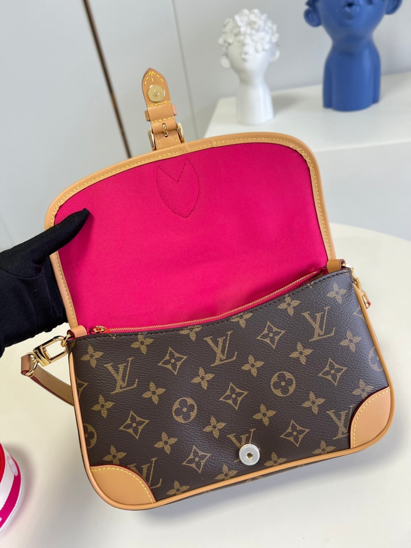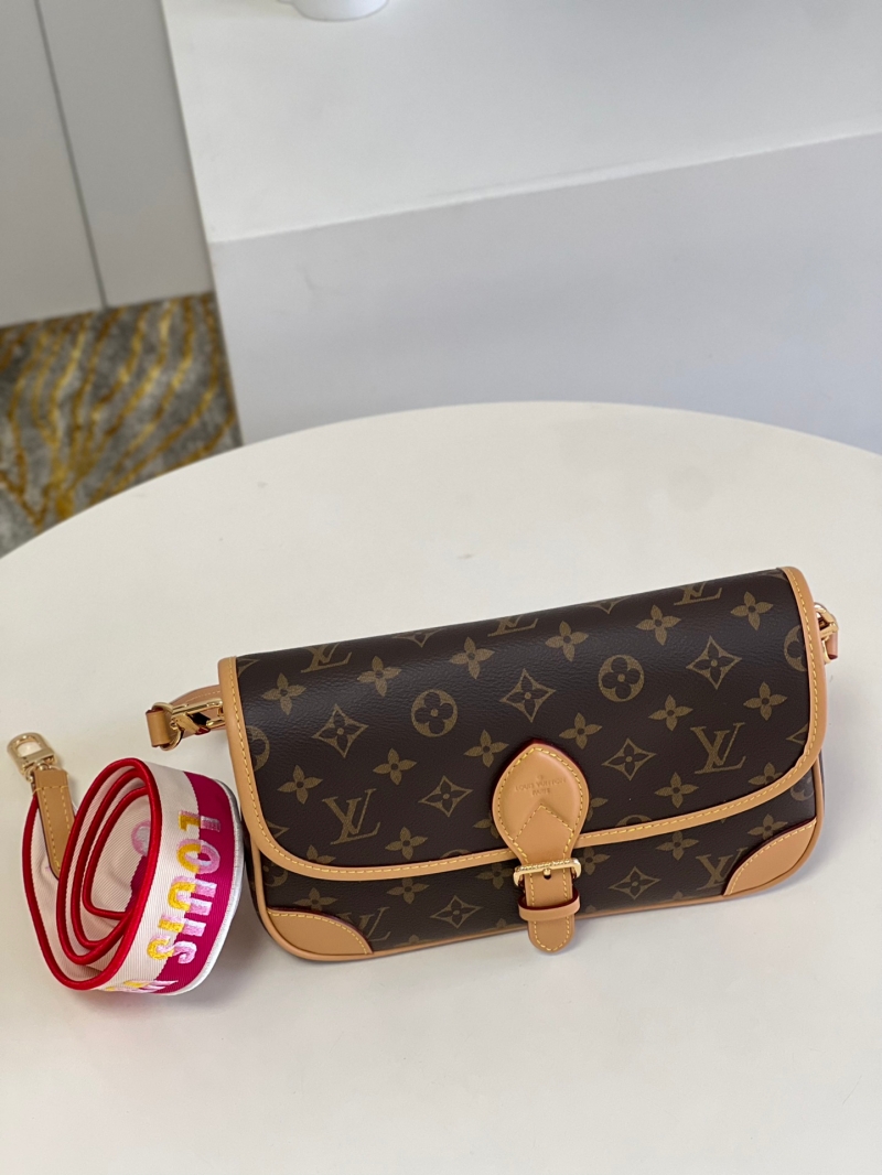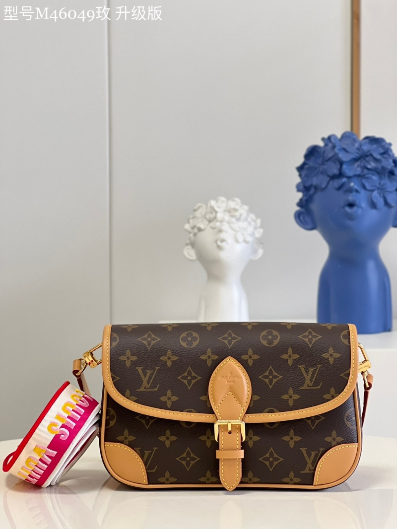 - 详细介绍:Diane 手袋重塑 1990 年代的经典设计,为 Monogram 帆布包身融入皮革包角和传统搭扣等复古元素,搭配口袋和齐整内层。宽幅提花肩带两面分别呈现醒目路易威登标识和 Monogram 花卉。