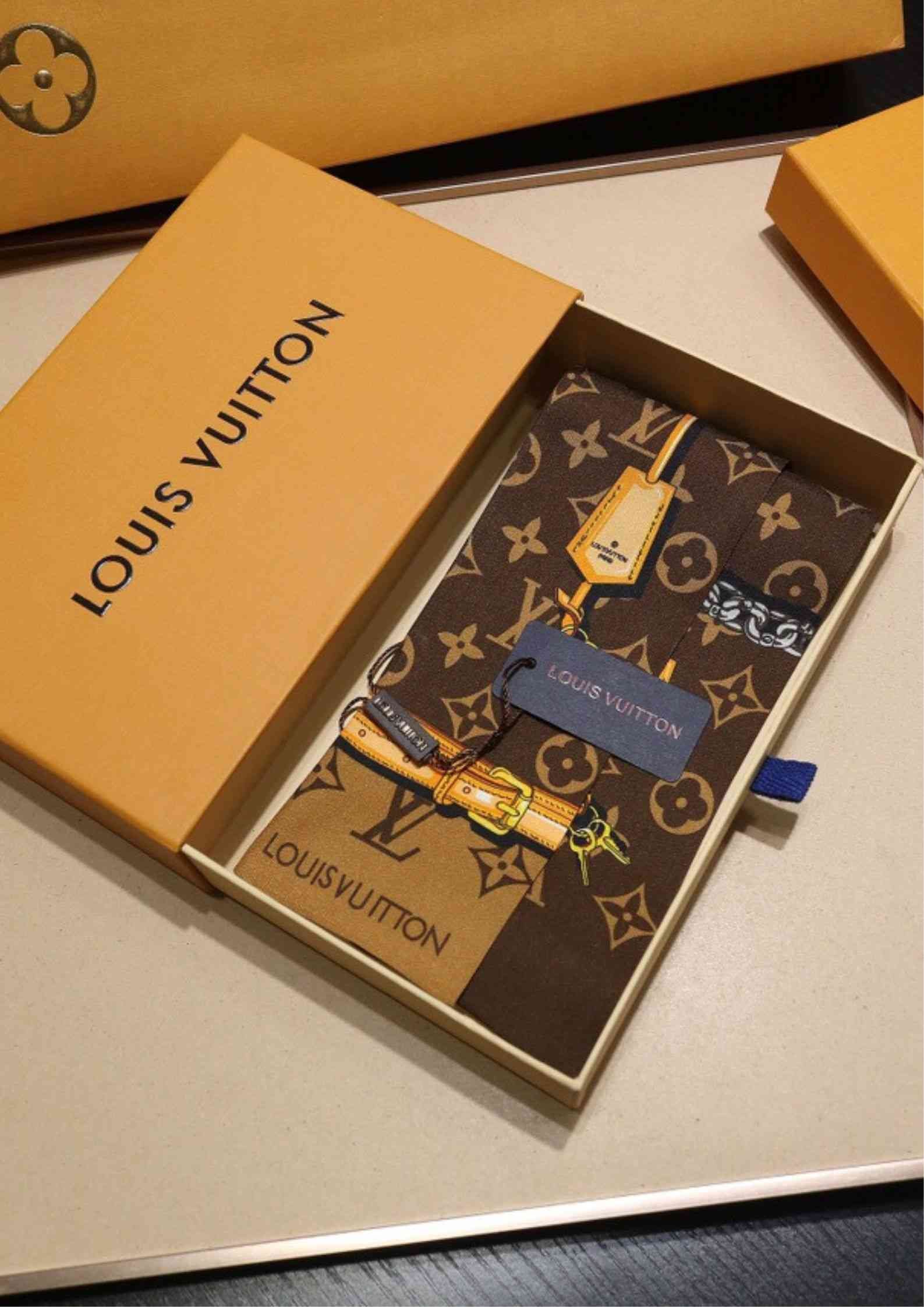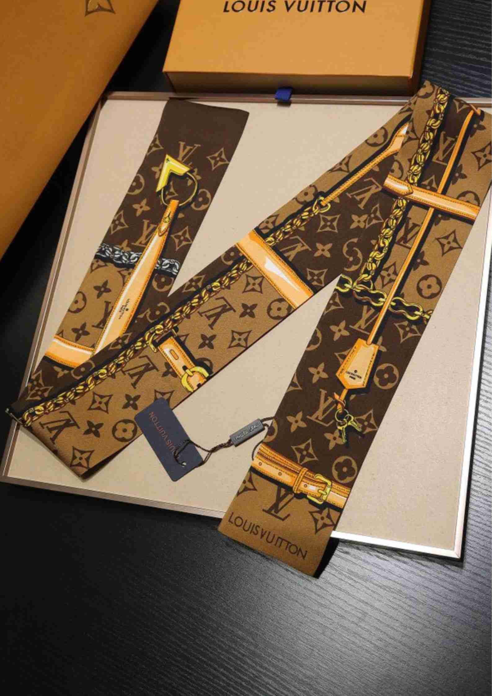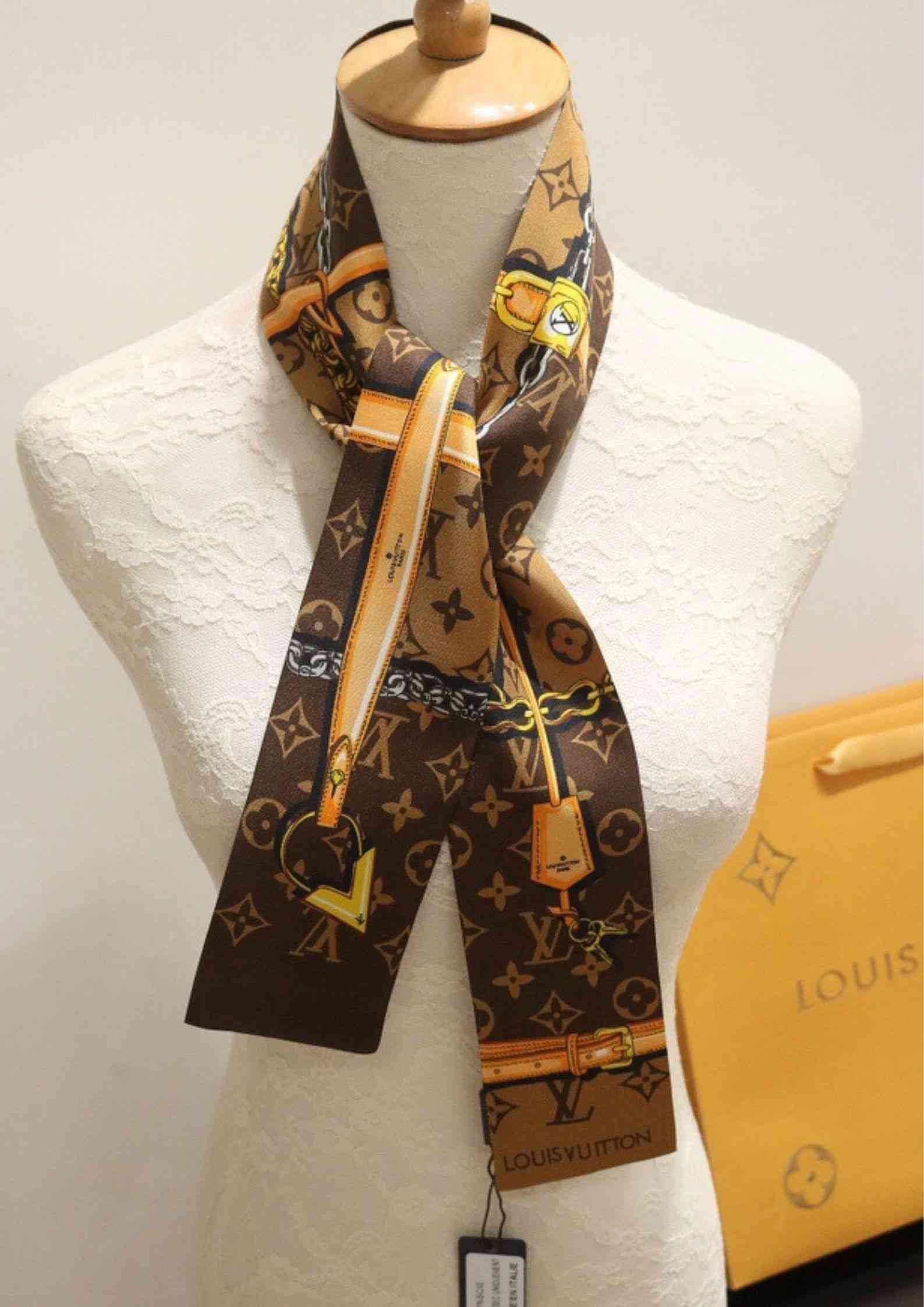 Monogram Confidential Bandeau 是一款多功能礼物创意。这款围巾印有品牌标志性图案,包括肩带、链条和挂锁,以 Monogram 图案为背景。这款时尚配饰可戴在脖子上、头发上或路易威登包包的手柄上。