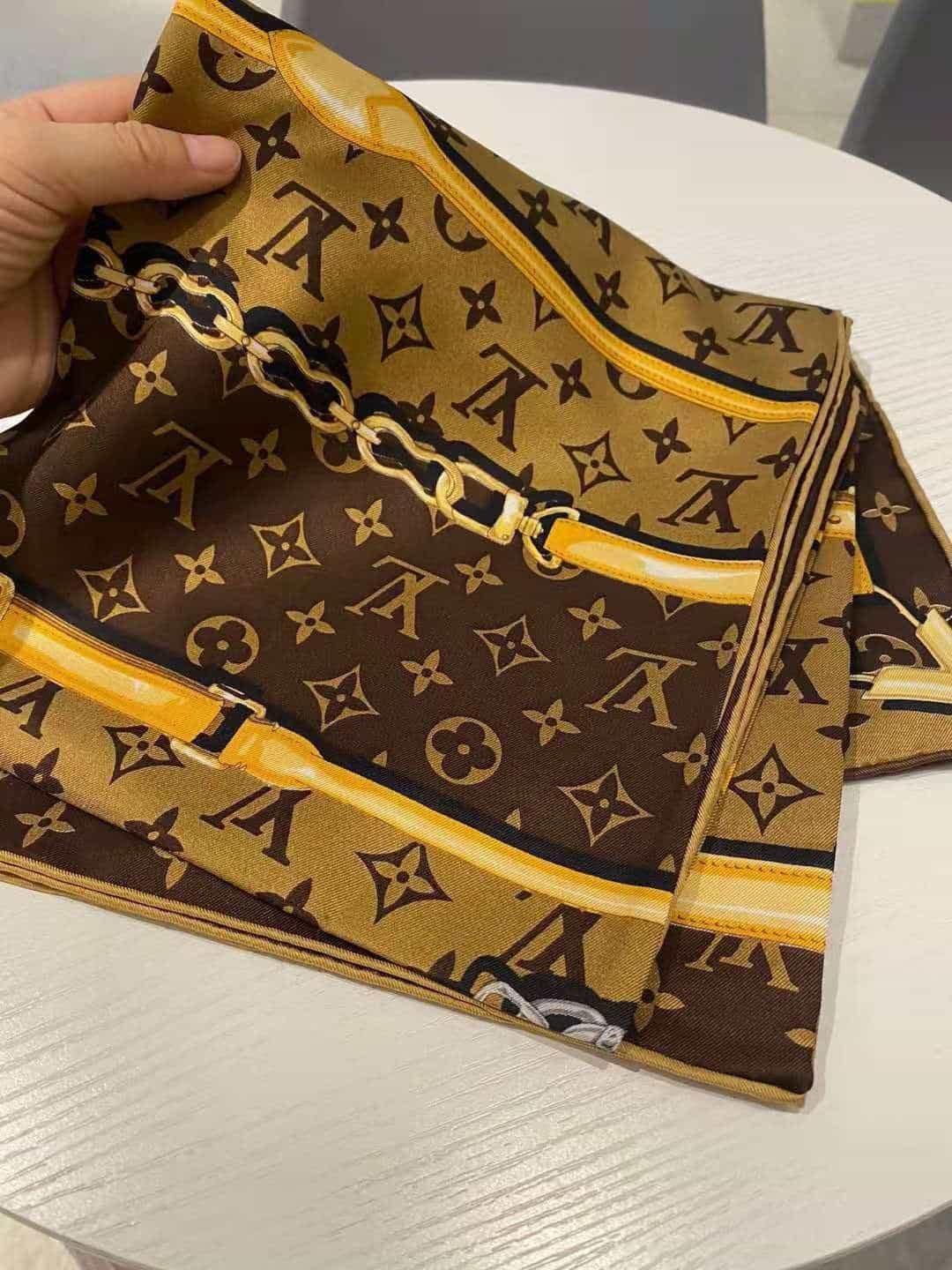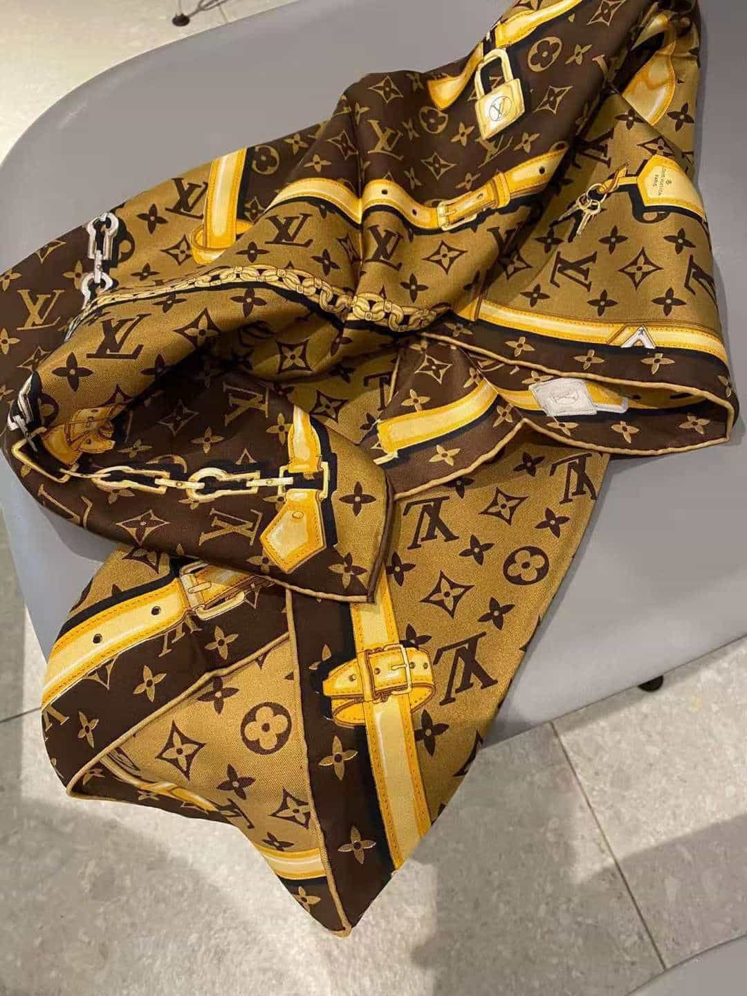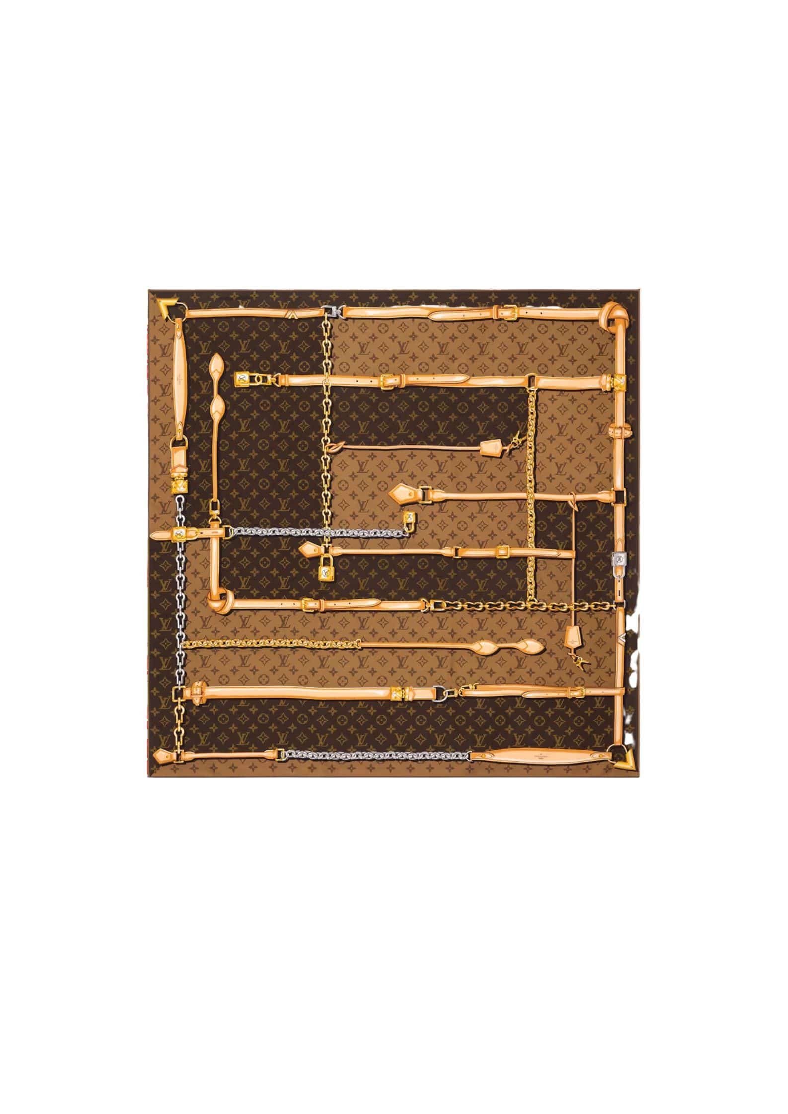 Monogram Confidential Square 90 颂扬 Houses Goods 传统。其时尚的路易威登标志性细节组合,包括表带、链条和挂锁图案,以经典的 Monogram 图案为背景。这款图形斜纹布单品是一款多功能礼物,可以以多种方式佩戴。