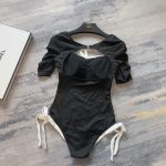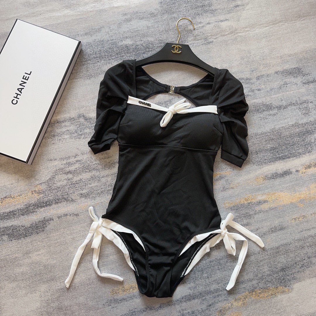 Chic and summer-appropriate beachwear in a lightweight swimsuit accented with white and black bows for a sophisticated signature look.