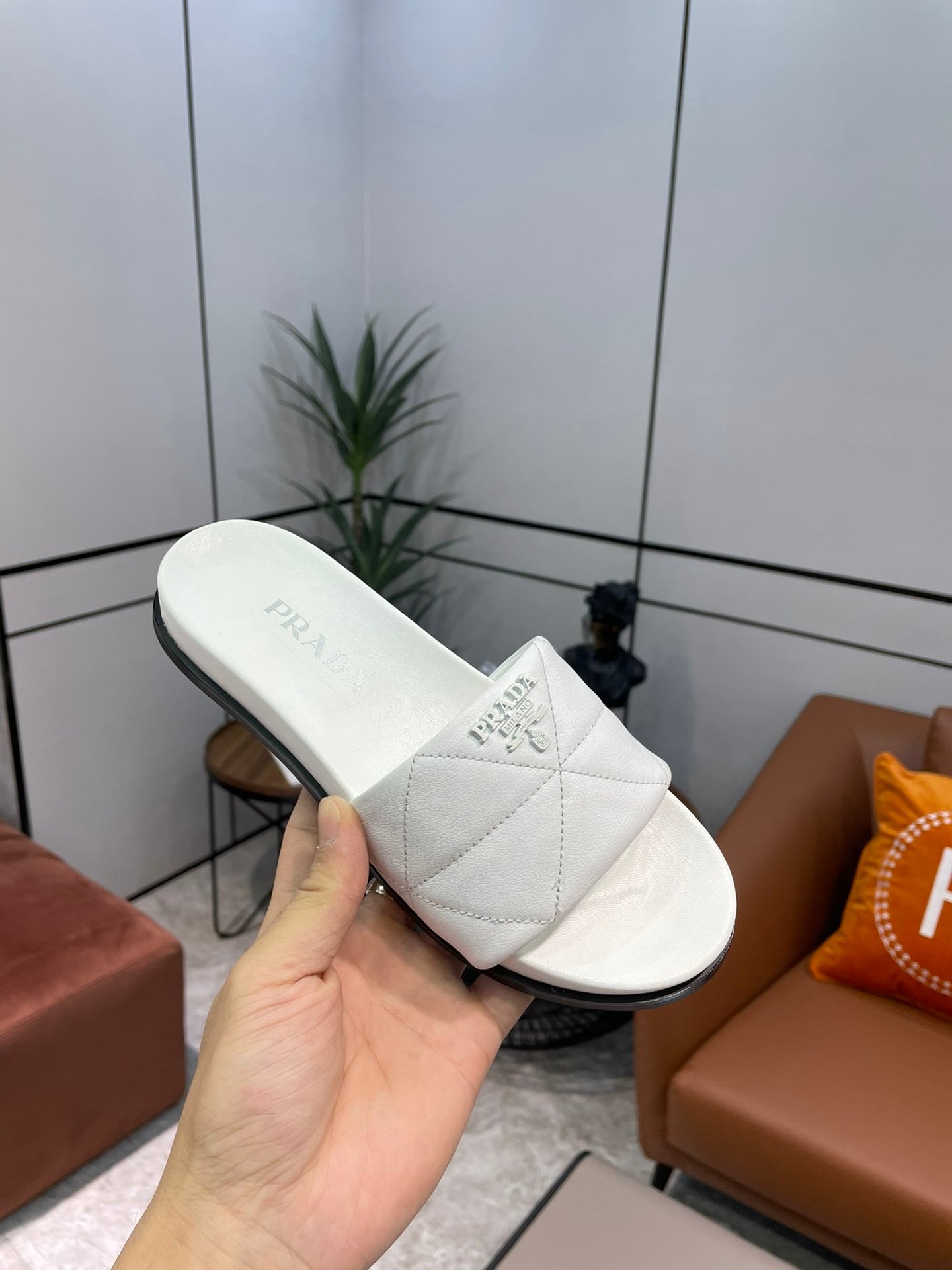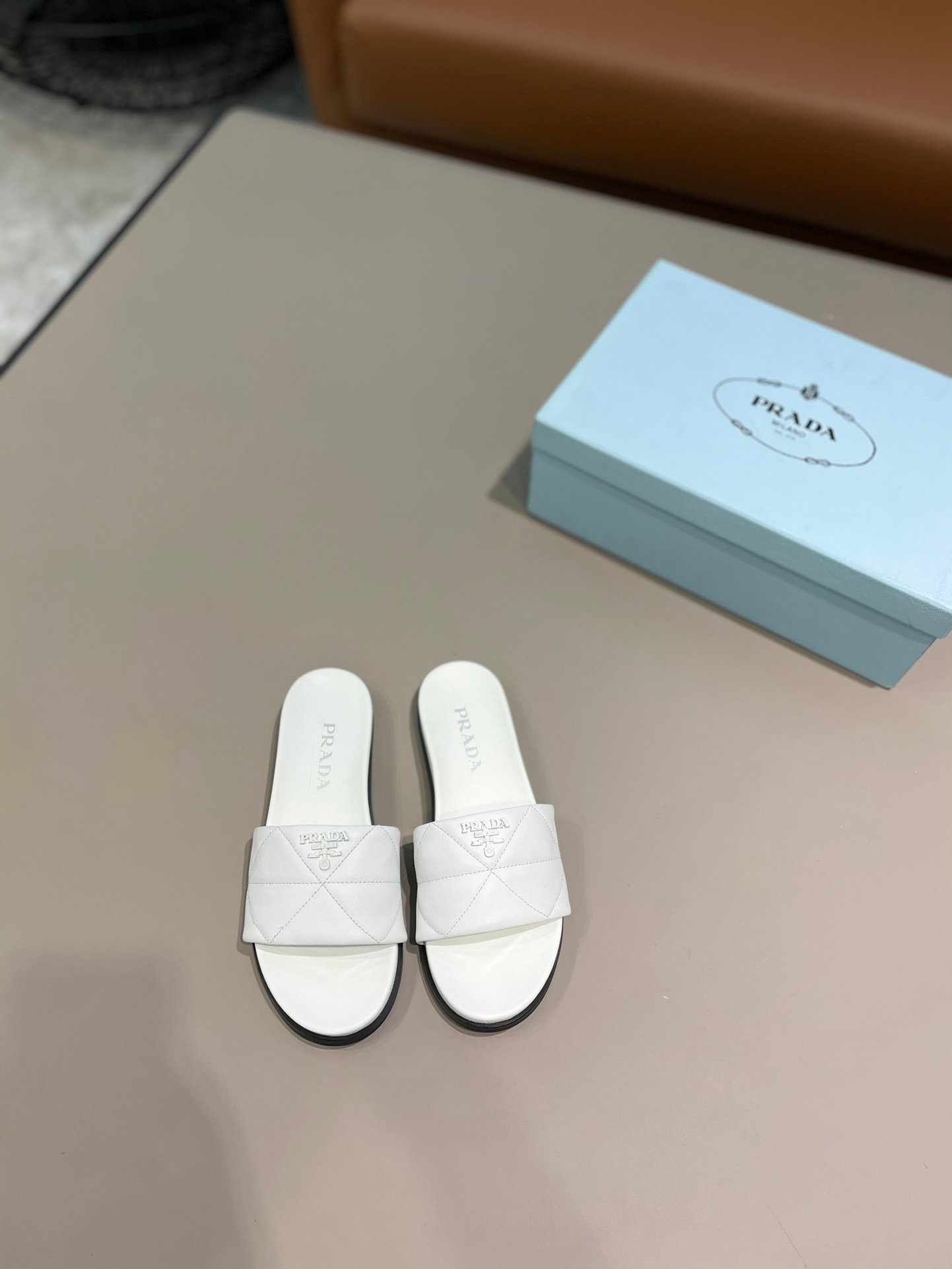 PRADA 白色压花徽标绗缝拖鞋,采用绗缝设计,