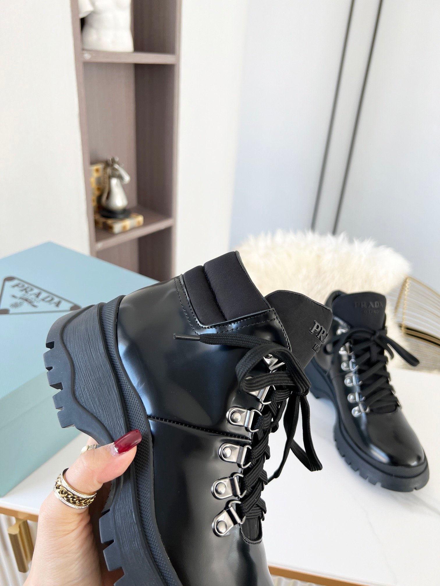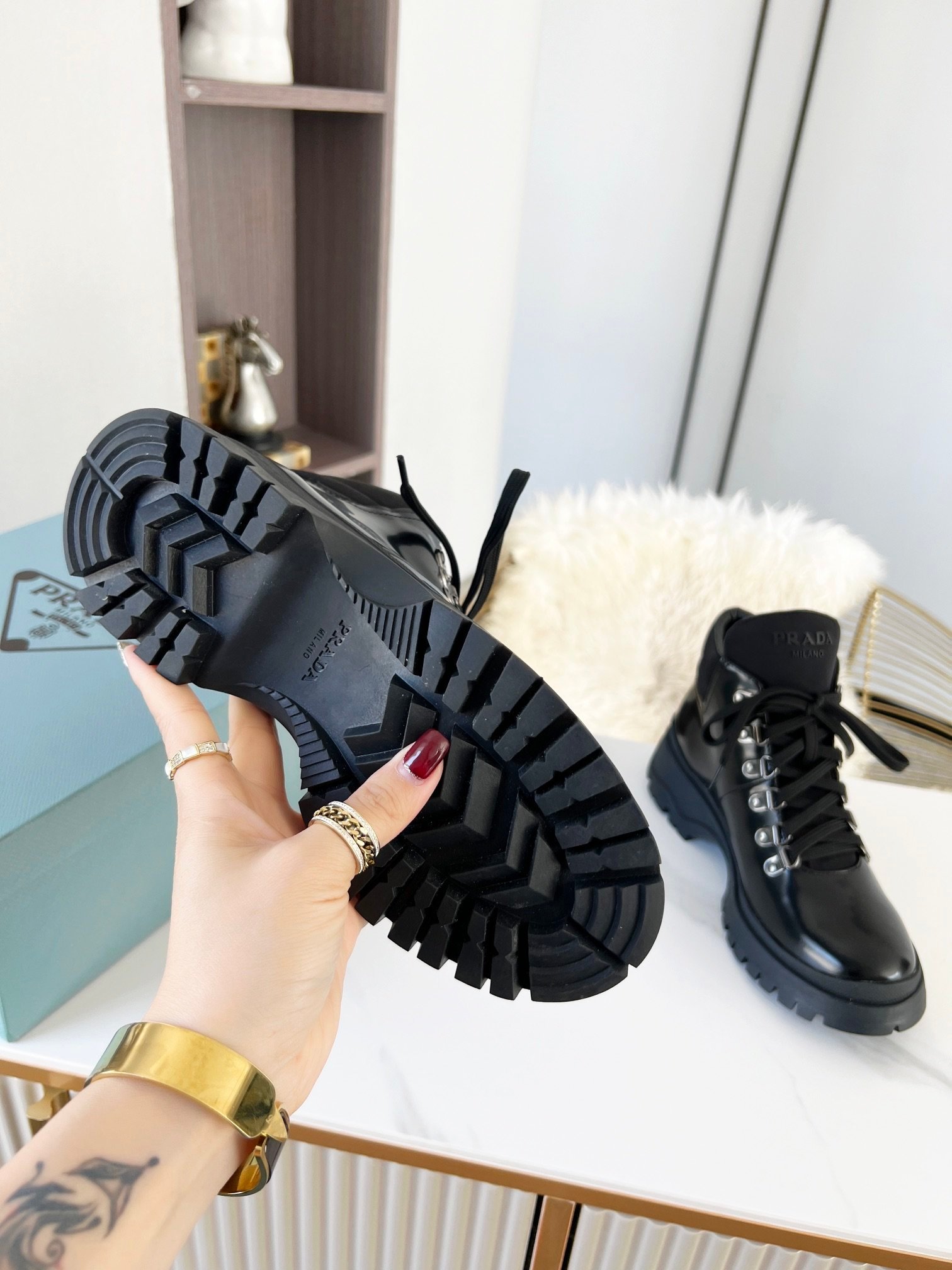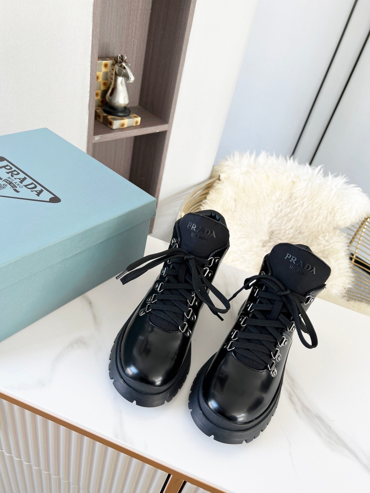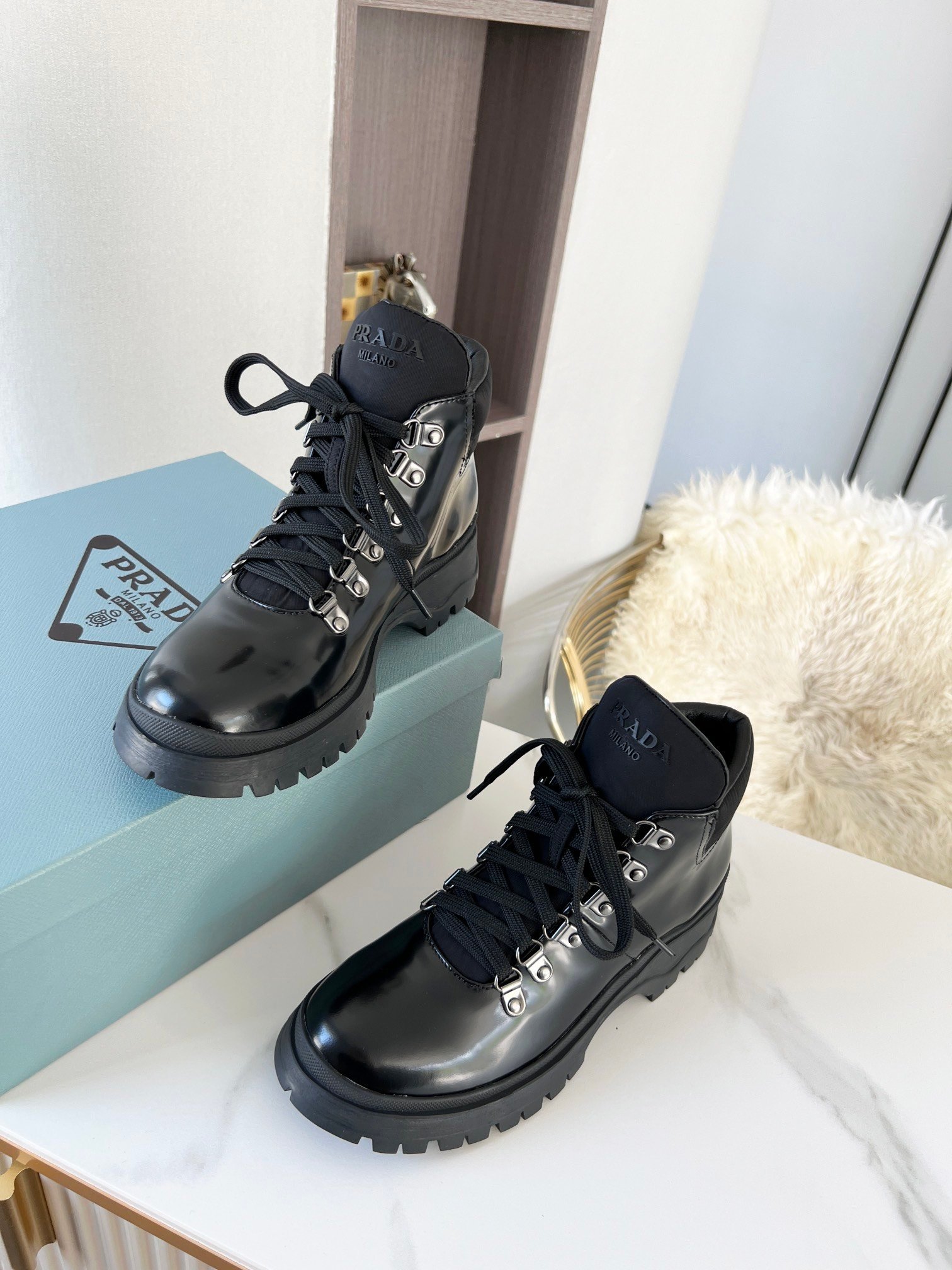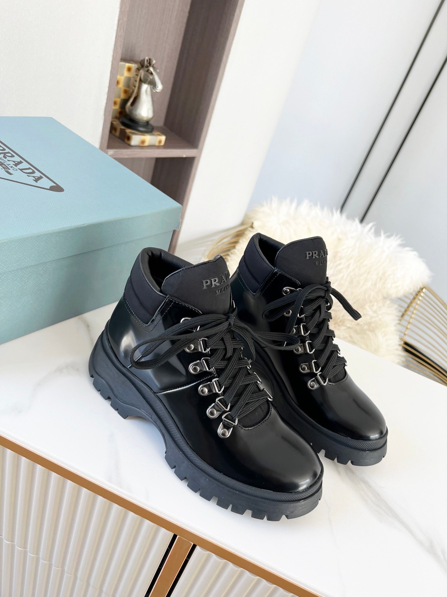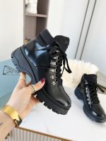 Prada 女士剪羊毛高帮运动鞋 黑色 PRD