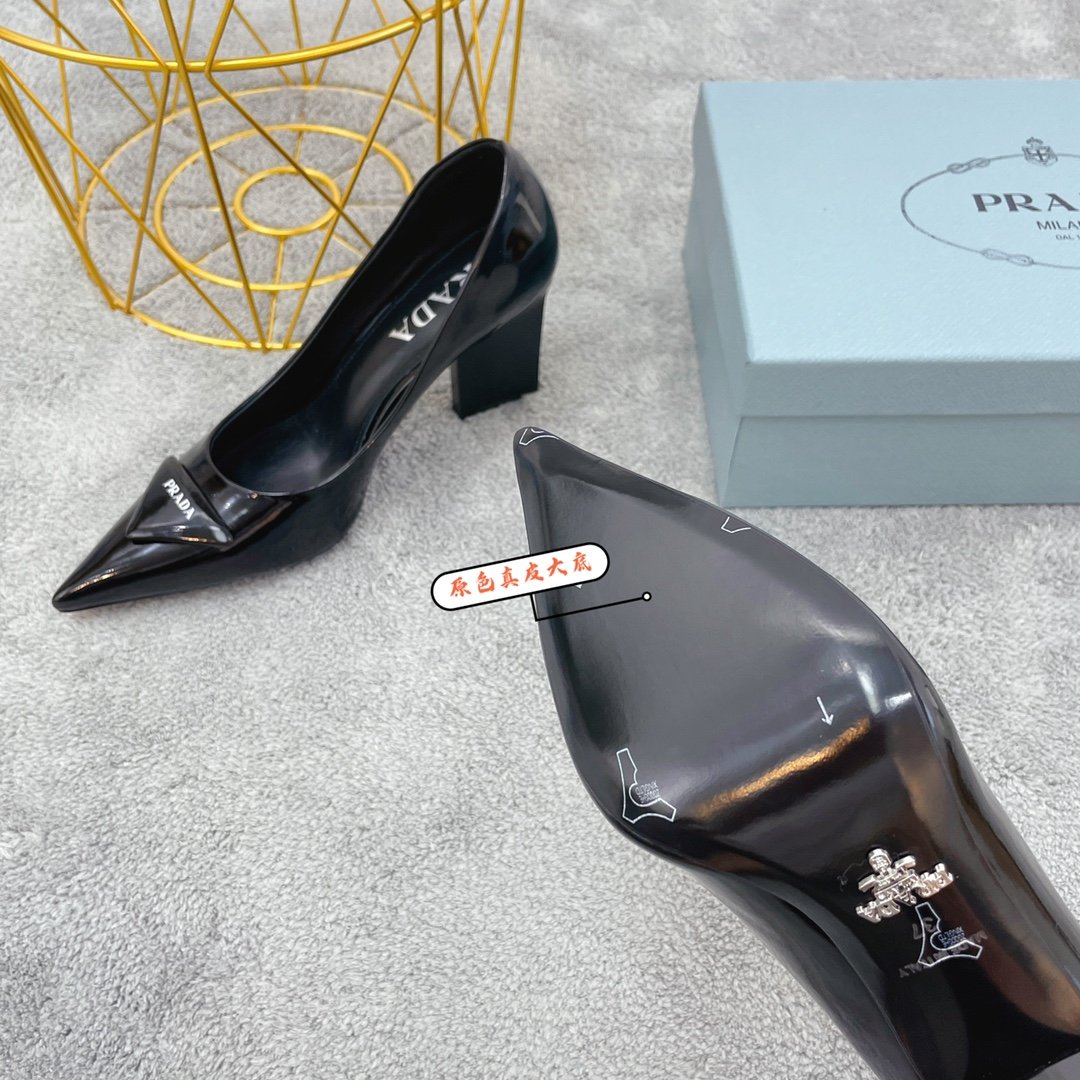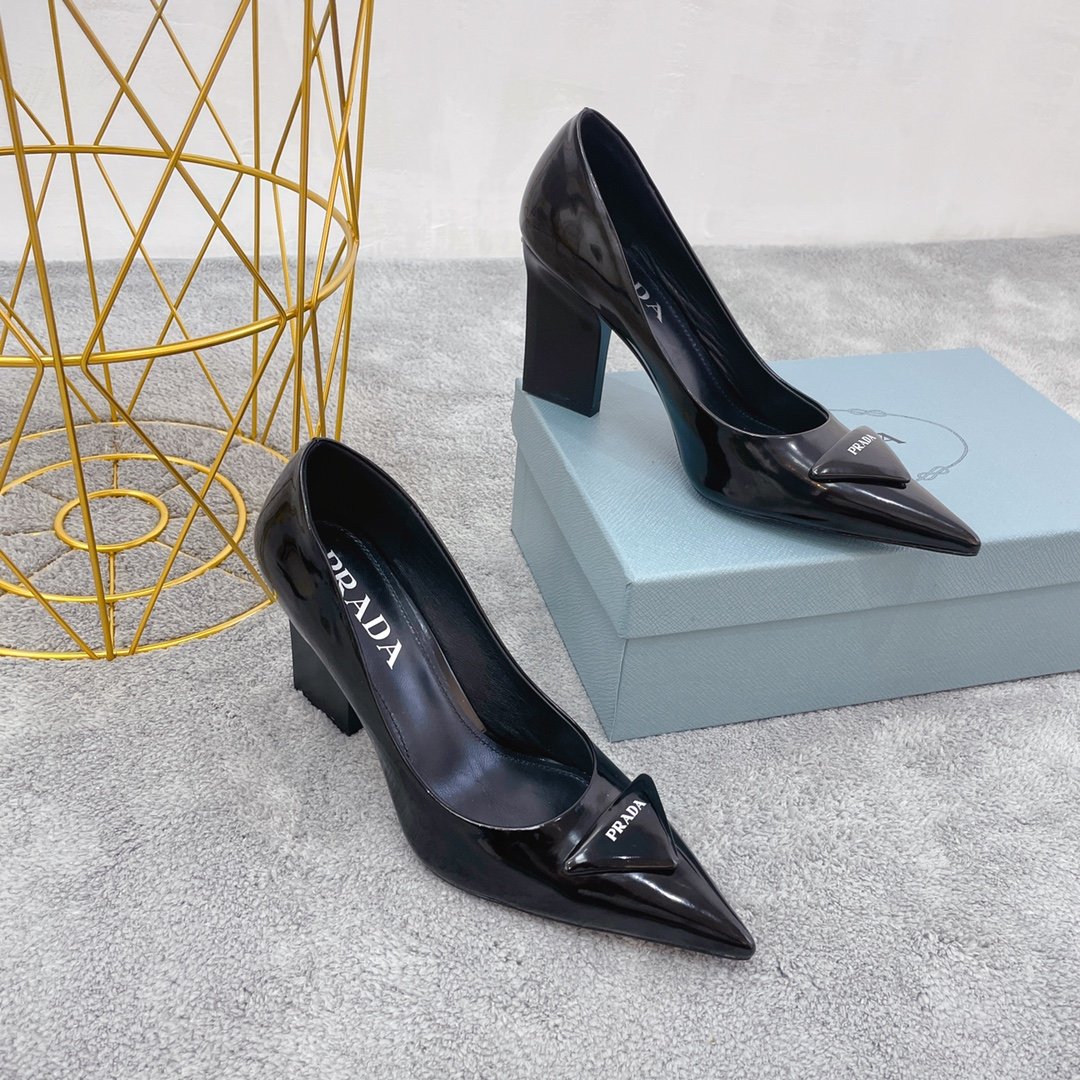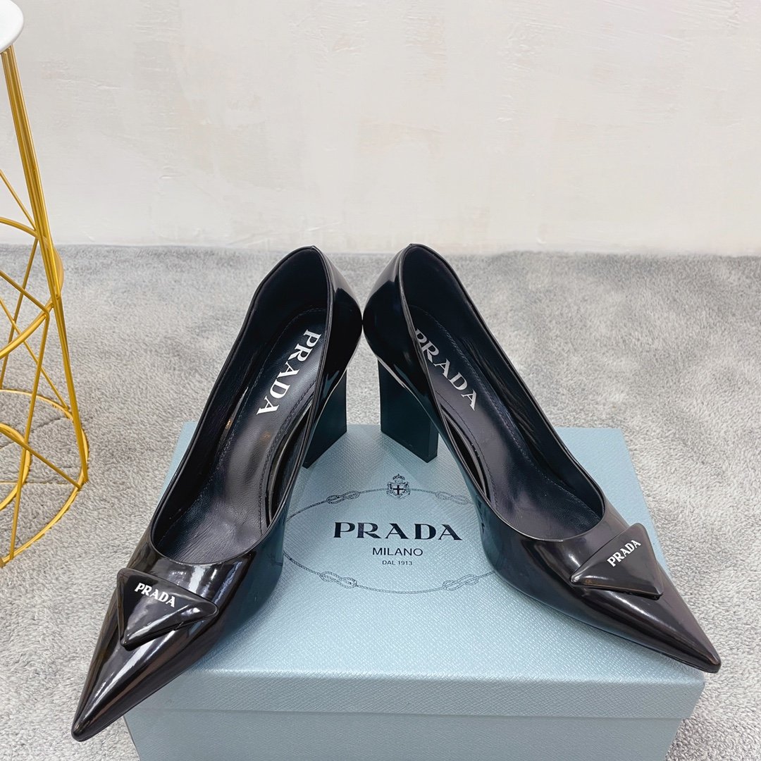 这些尖头高跟鞋由拉丝制成,鞋跟涂有漆面,展现永恒的优雅。该鞋款饰有标志性的珐琅金属三角形标志,该标志首次出现在 1913 年由 Mario Prada 设计的旅行箱上。