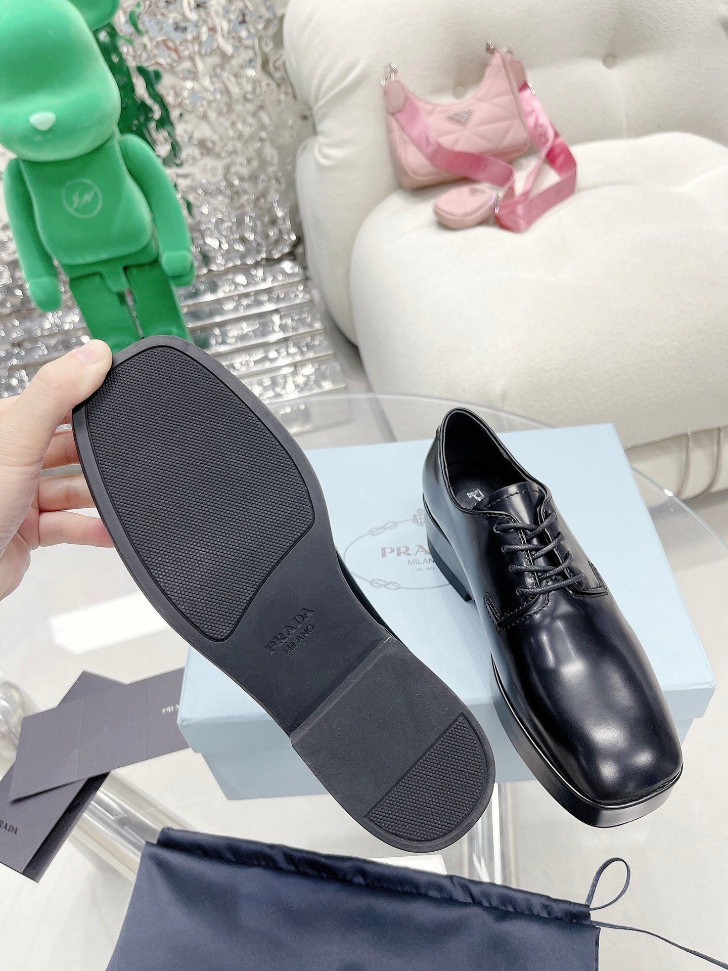 这些德比鞋通过添加现代主义、极简主义风格重塑经典正装鞋履,采用拉丝标志性材料制成自 90 年代以来一直与奢侈品界紧密相连的品牌。创新的橡胶鞋底增添了意想不到的气息,而 Prada 标志性的三角形作为橡胶细节装饰在鞋后部。