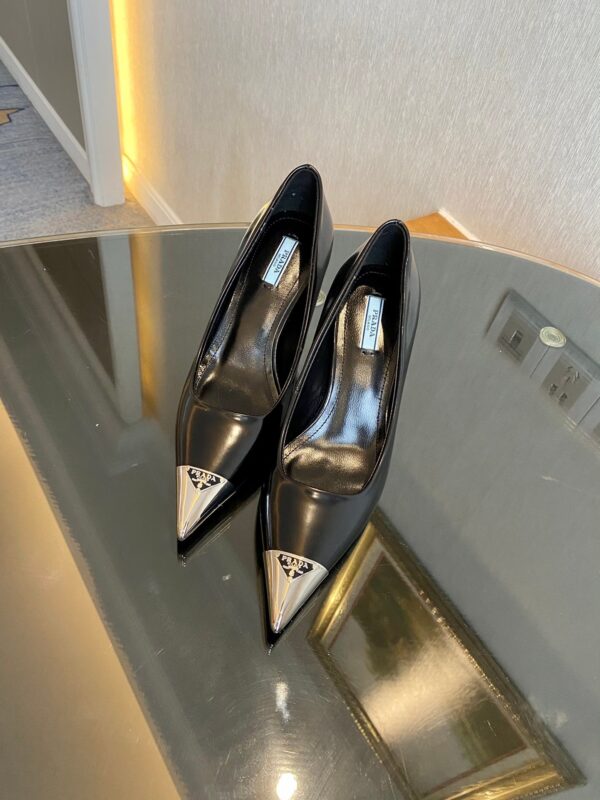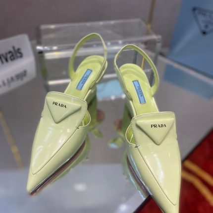 极简主义和女性气质在露跟鞋(Prada 系列的标志性风格)的全新诠释中相遇。尖头鞋型和现代主义坡跟鞋款重新演绎了该品牌独特三角形的几何形状,其形状启发了鞋跟结构以及包覆和轻微加垫的前部细节。体积和结构的运用强调了鞋子干净、果断的线条,采用精细拉丝和漆面制成。