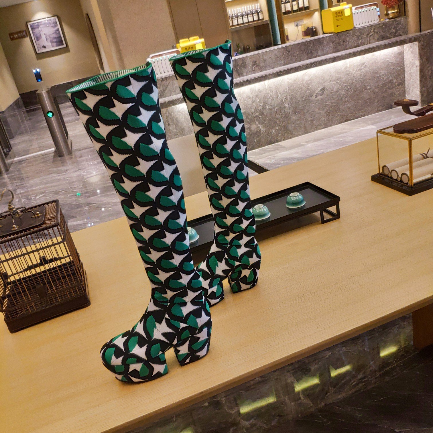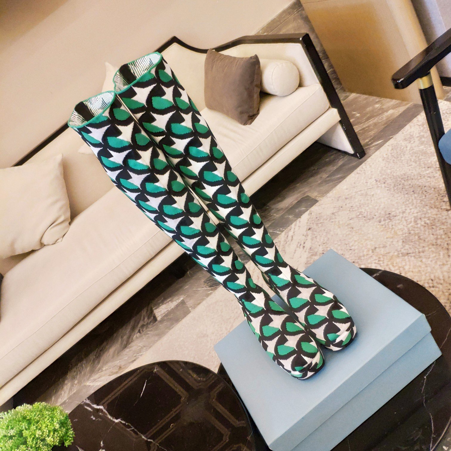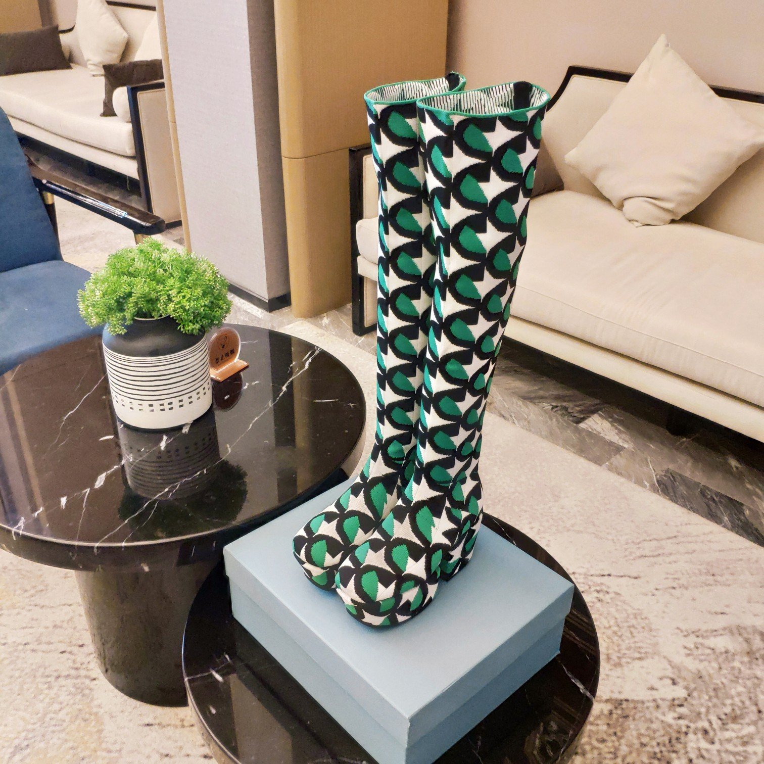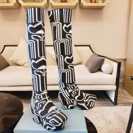 Prada 及膝靴采用弹力技术针织面料制成,饰有撞色提花图案,下摆饰有撞色刺绣字母徽标。圆头。几何高跟和网布厚底。橡胶外底。织物内饰,不可拆卸的徽标皮革鞋垫。季节:春季 – 夏季。