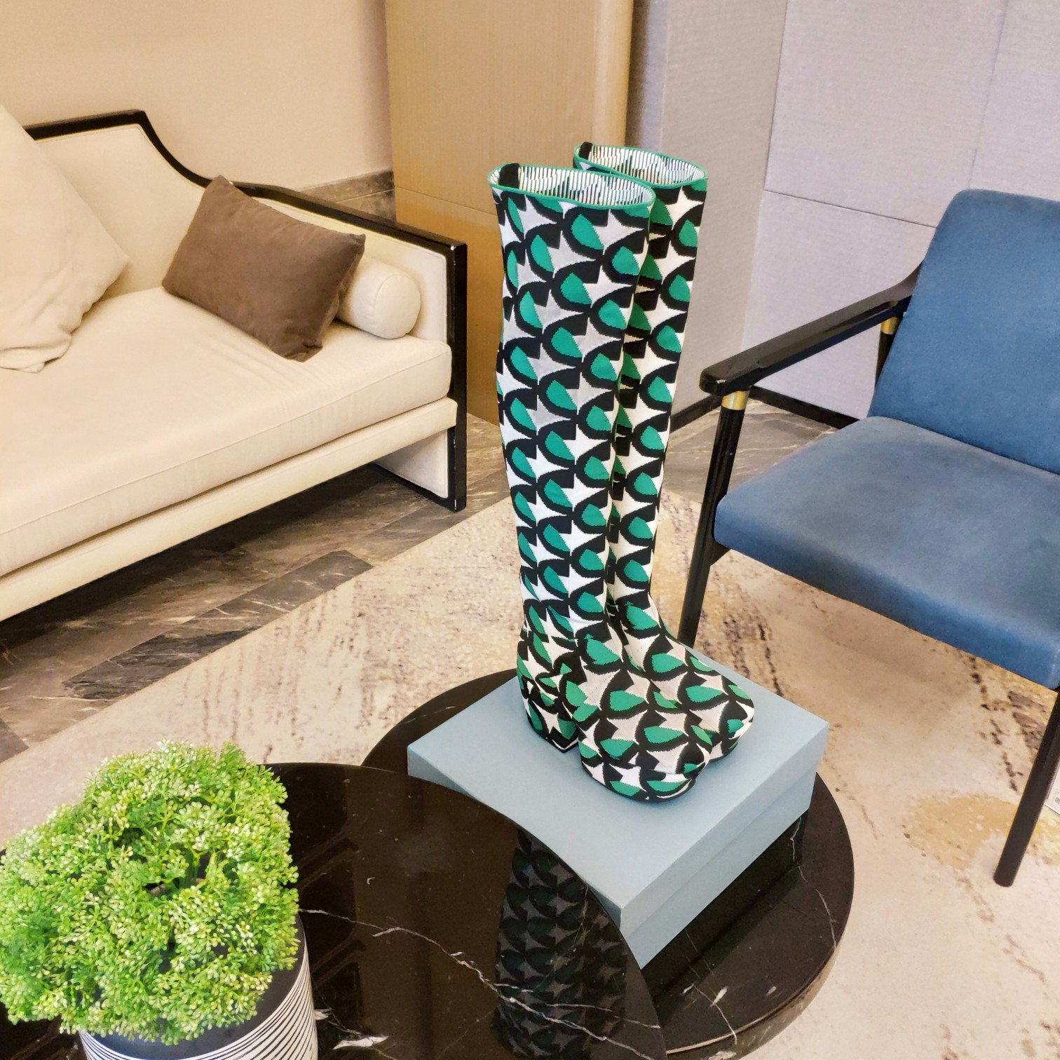 Prada 女式提花刺绣蓝色/白色高筒靴 PRD