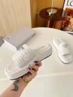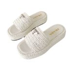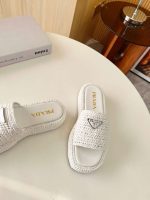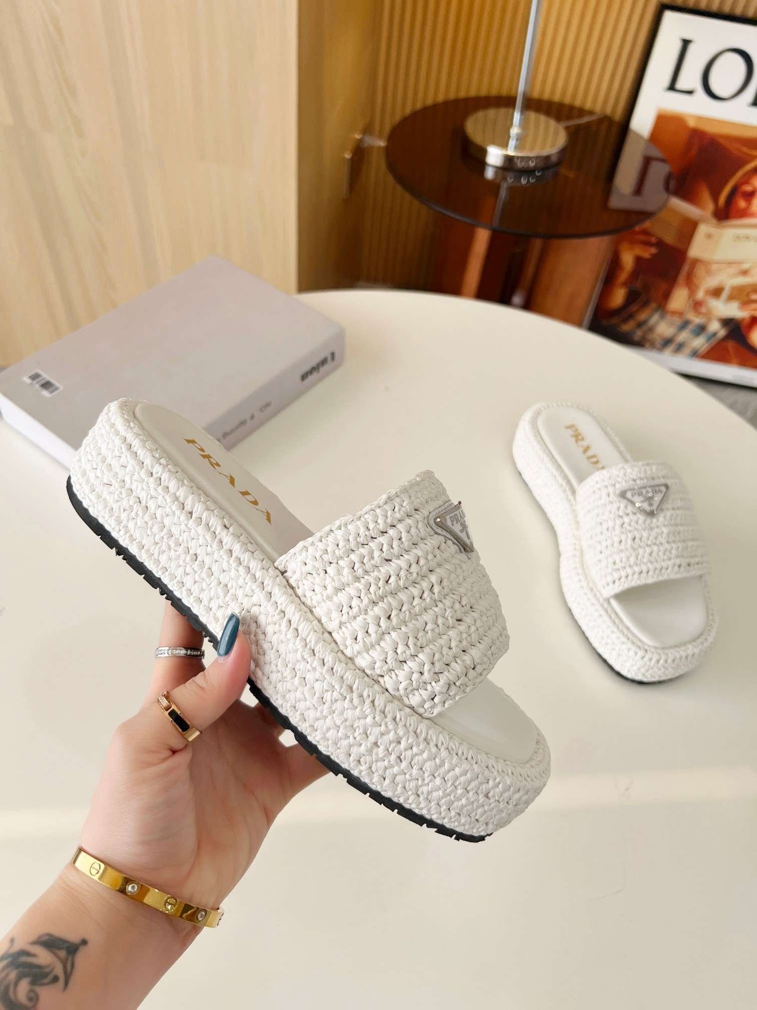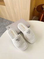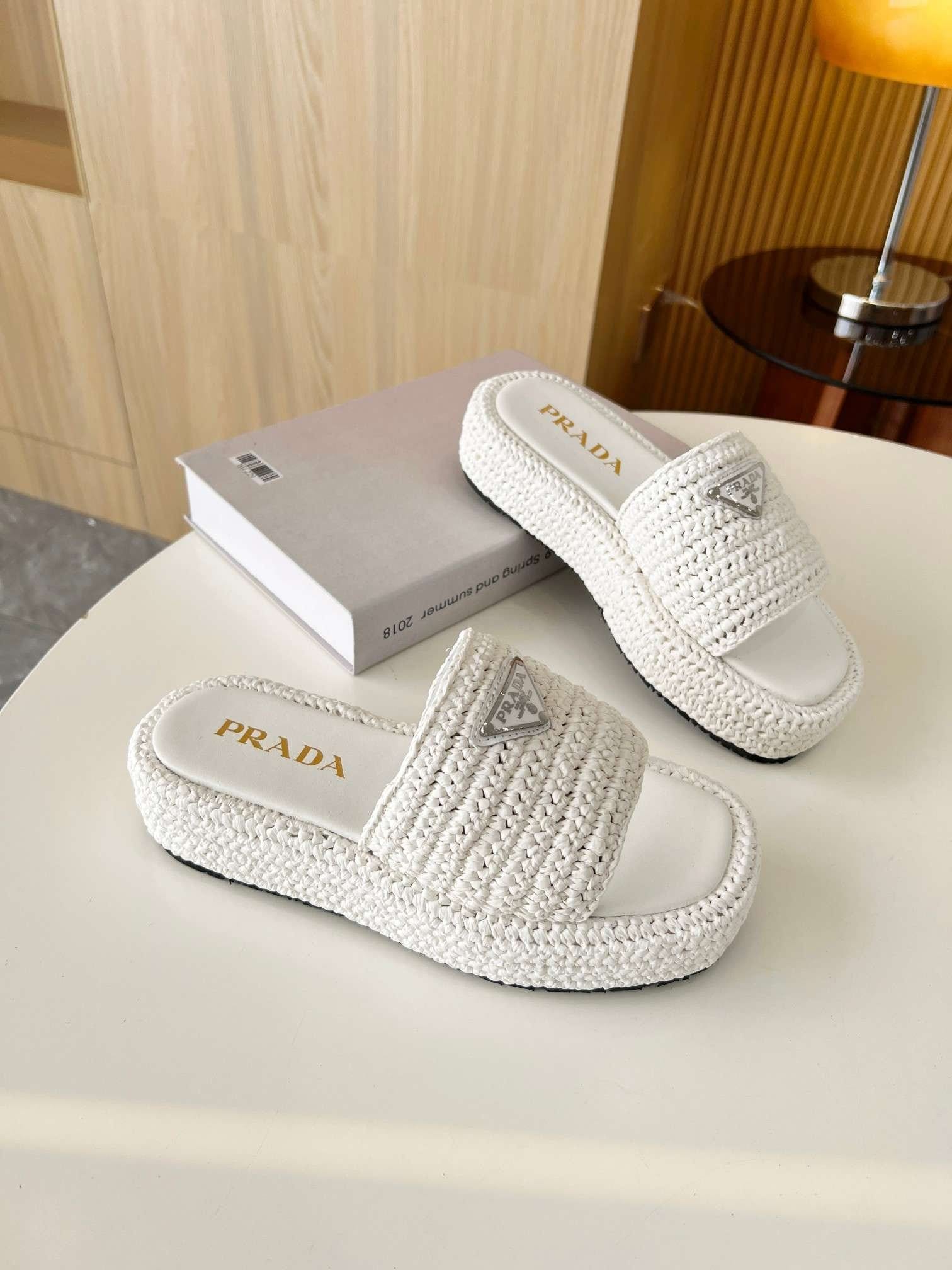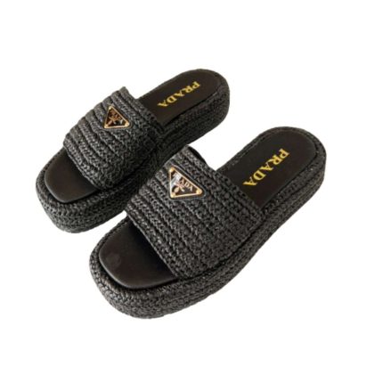 简单而精致的钩针编织图案增强了这款平底凉鞋的设计,装饰有 Prada 的金属三角形徽标,为凉鞋带来标志性的气息。