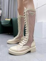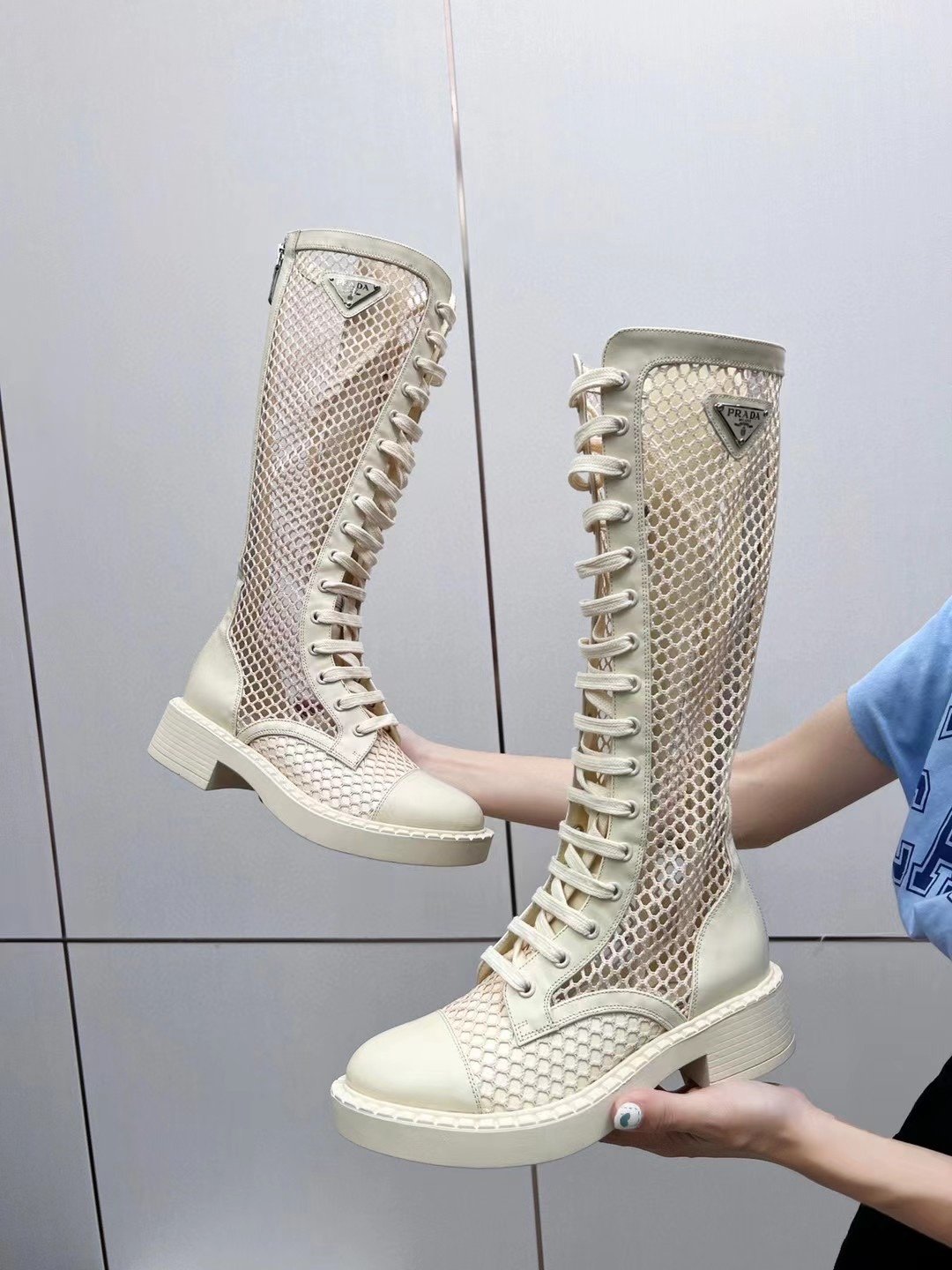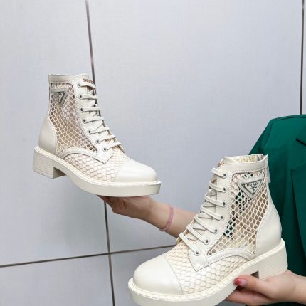 以创新和现代主义方式重新设计的严谨形式激发了这些系带靴子的灵感,采用不同的材料和生产技术制成原始效果。网眼鞋面与采用标志性 Prada 拉丝材质的鞋头形成鲜明对比,而橡胶鞋底则完善了设计。