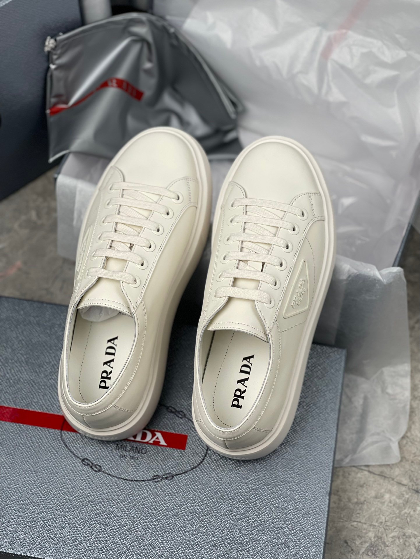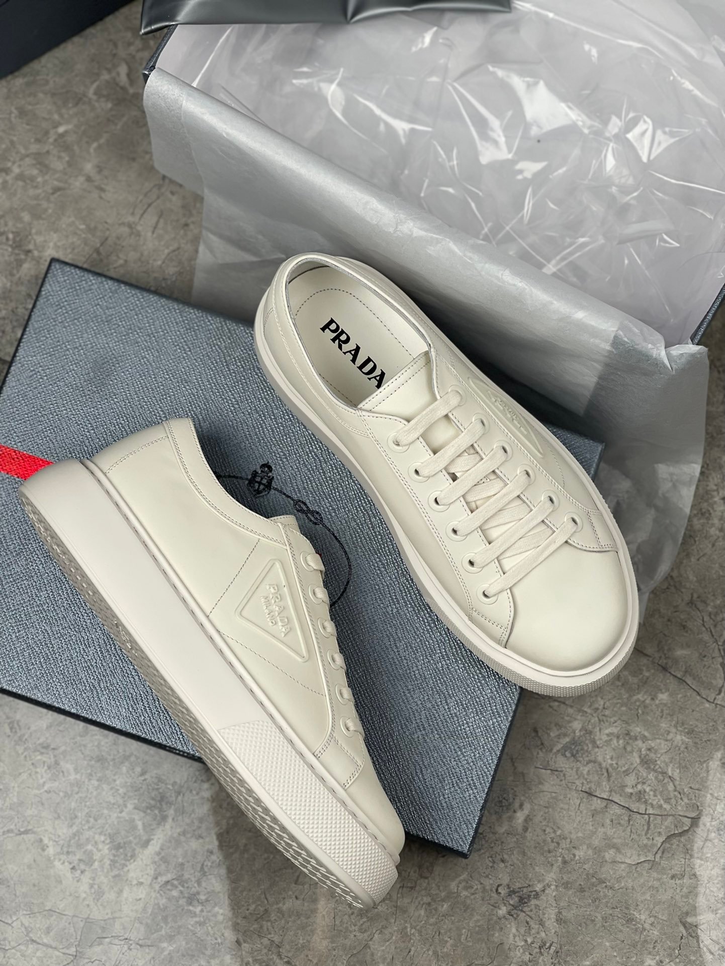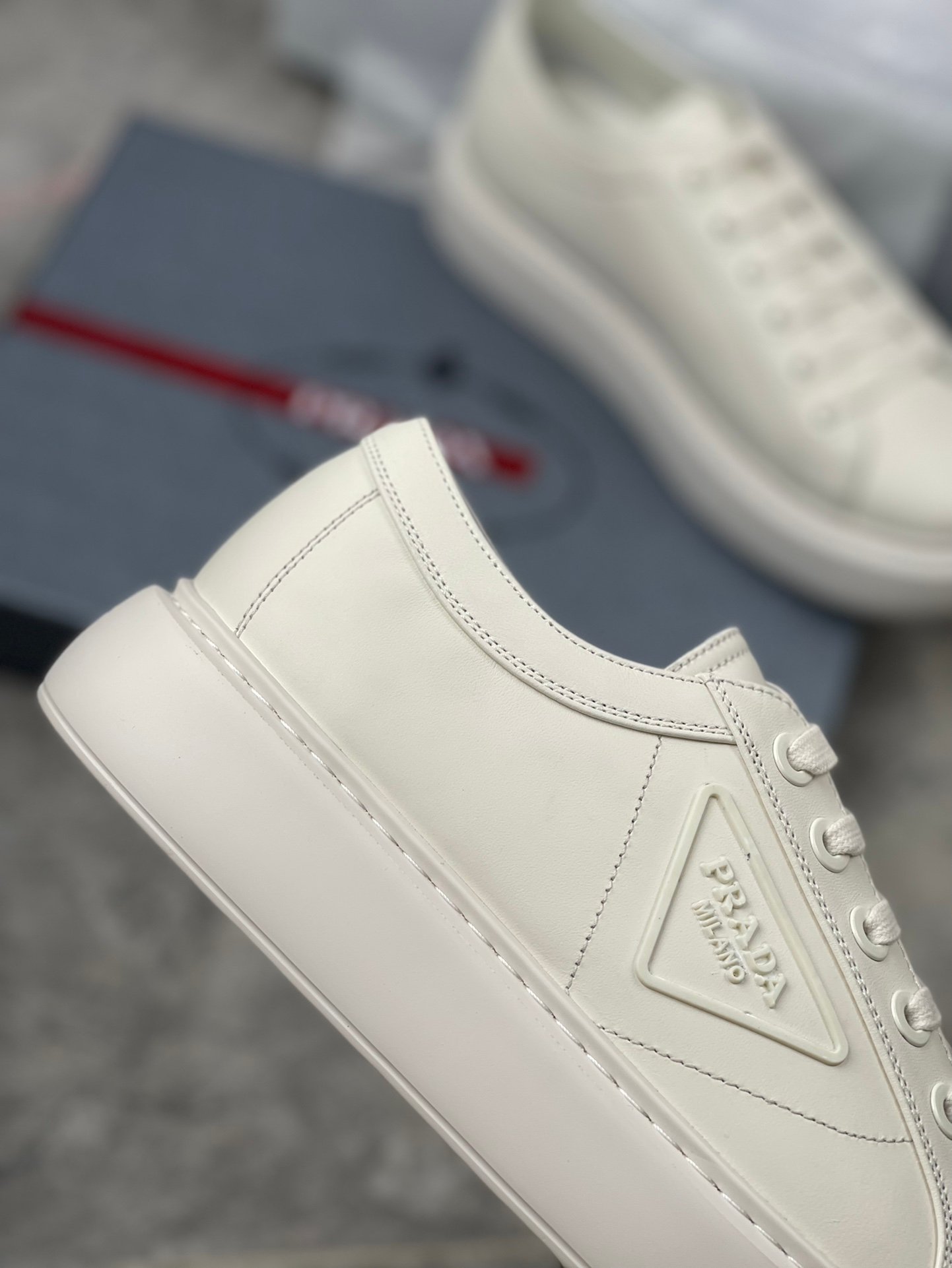 鞋面有 Prada 橡胶三角形徽标