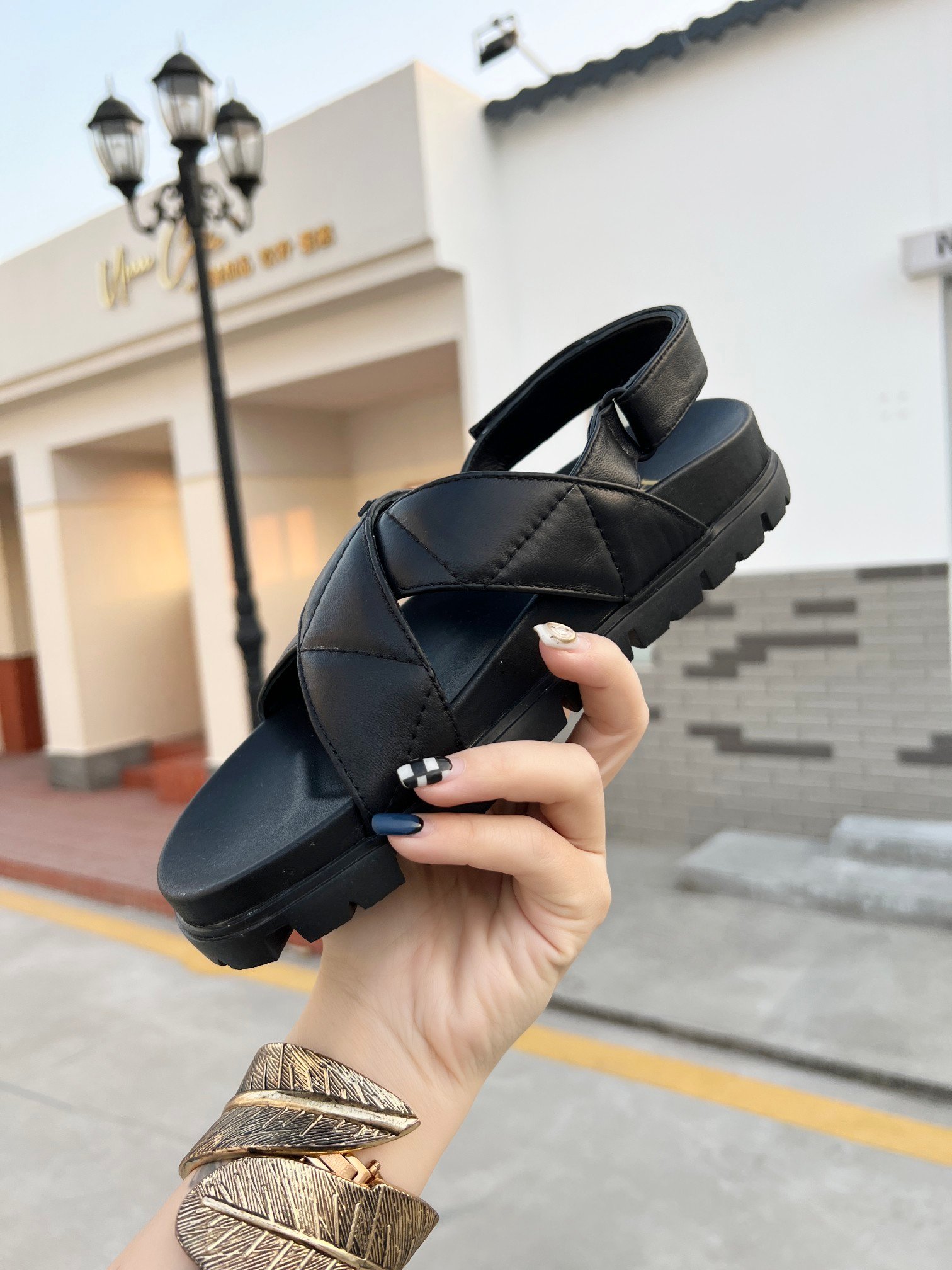 体积、柔和的线条和对 90 年代的参考定义了这款凉鞋的包覆平底鞋底。这些凉鞋的柔软纳帕革绗缝图案与标志性的 Prada 三角形相呼应,并饰有刻字徽标。