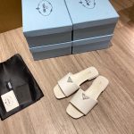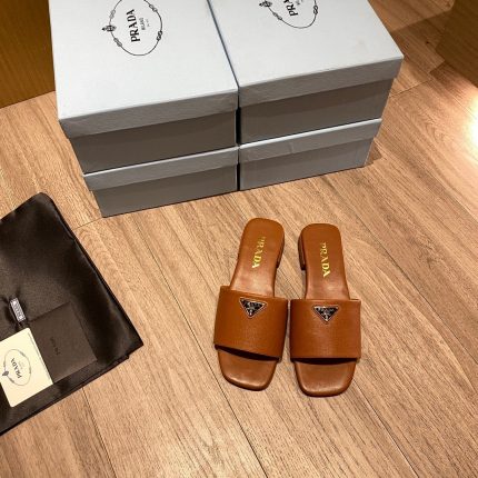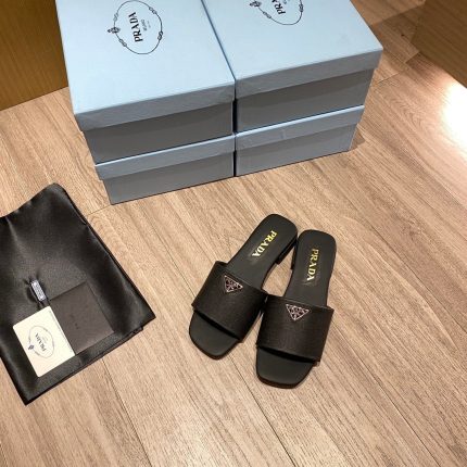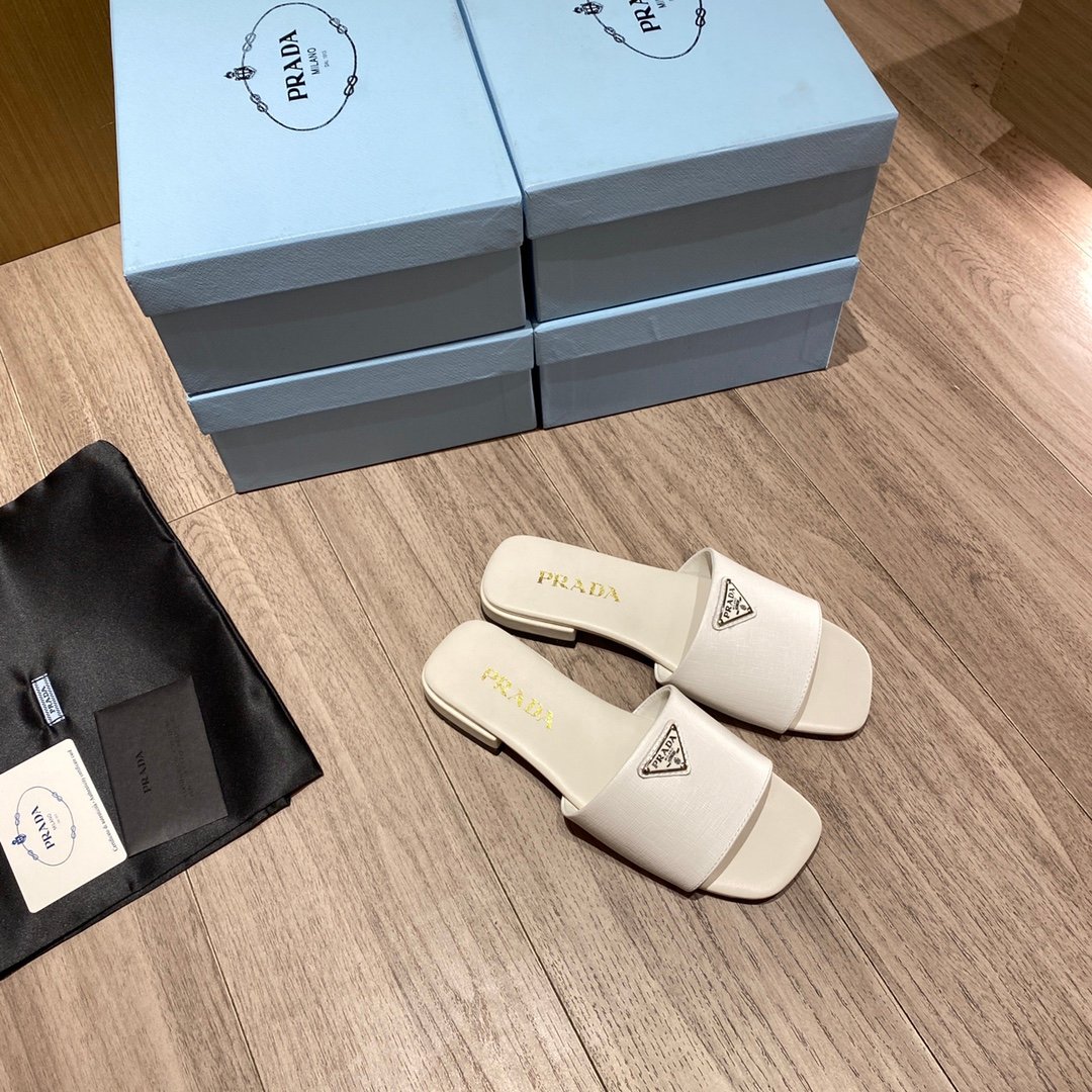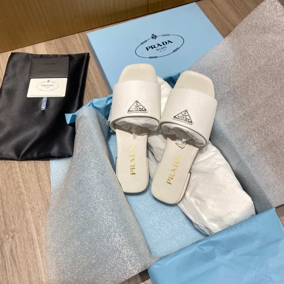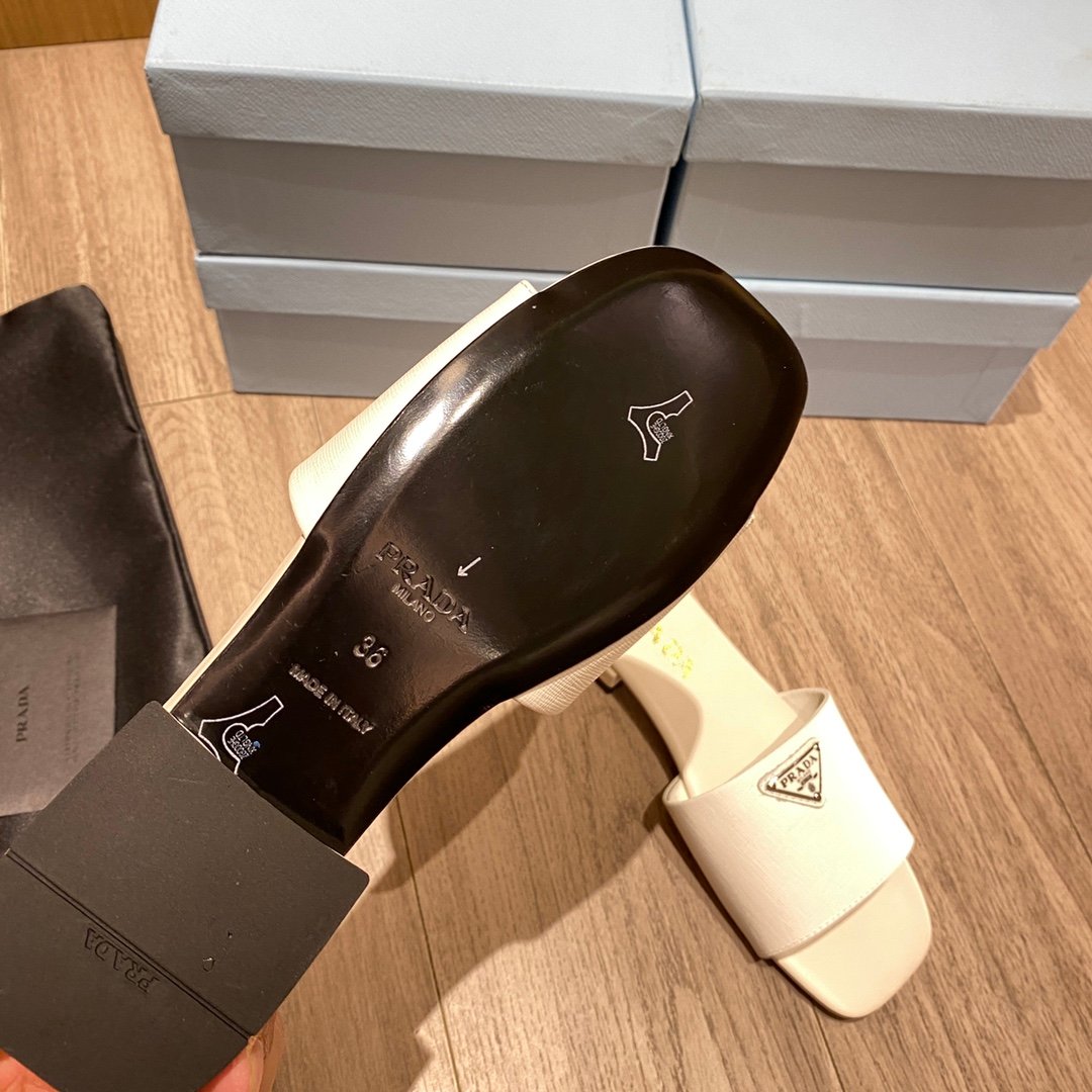 这些时尚的拖鞋采用品牌标志性的 Saffiano 材质制成,饰有三角形徽标,营造出标志性的气息,彰显精致、女性优雅气质。 Saffiano 是奢华的代名词,与传统的意大利产品生产联系在一起:这种高品质是由其交叉纹理和打蜡表面定义的。