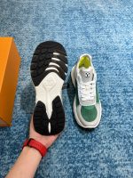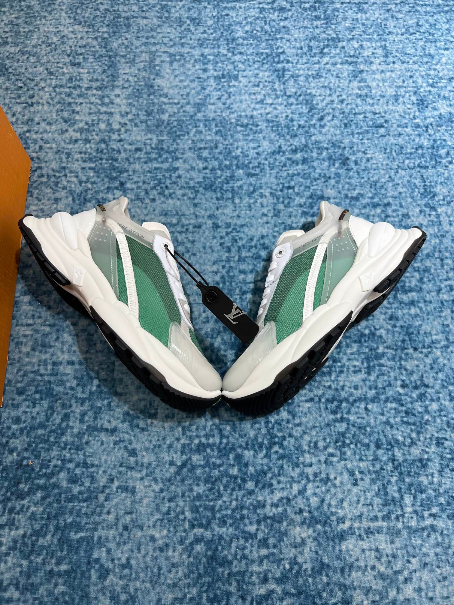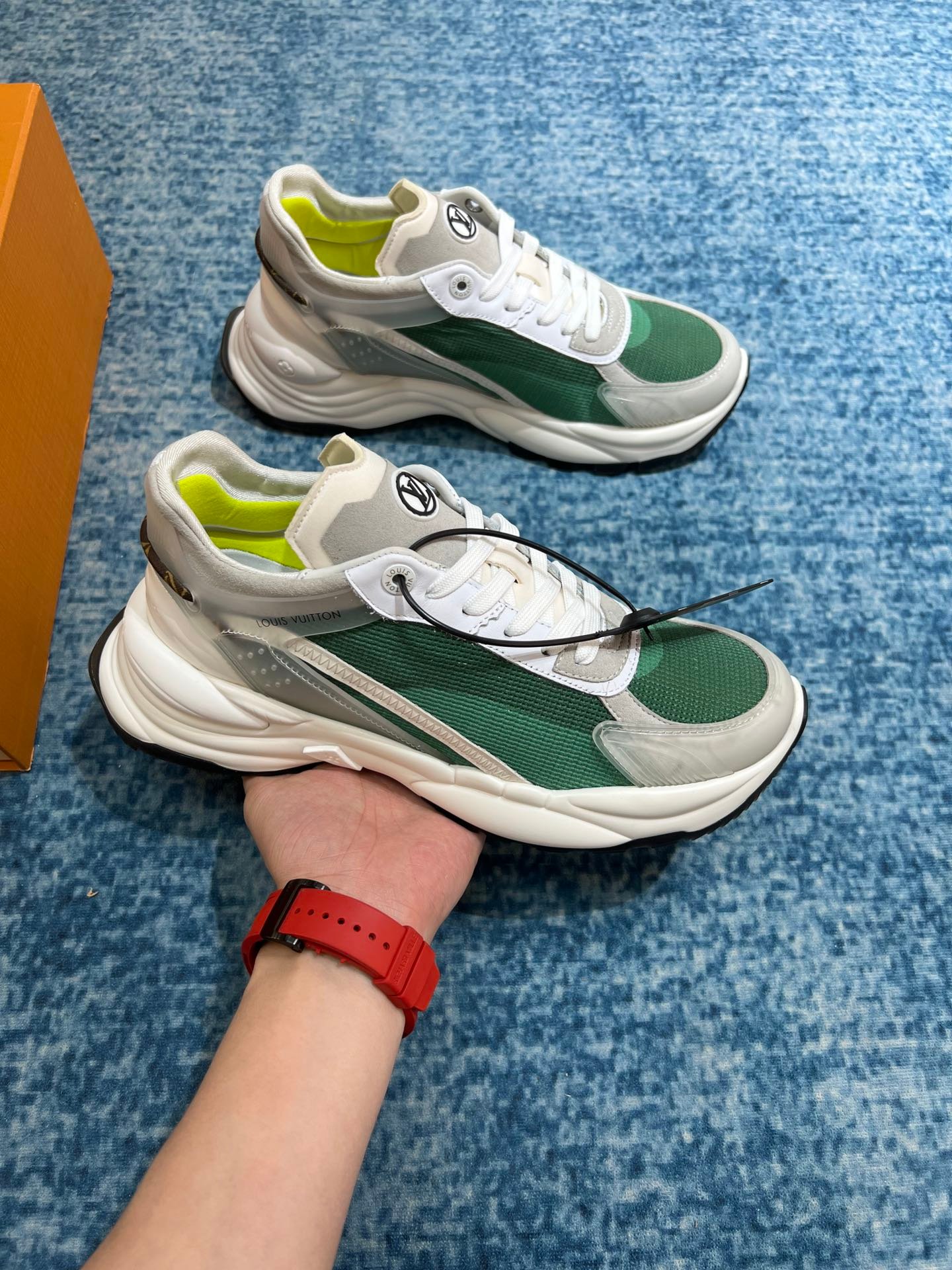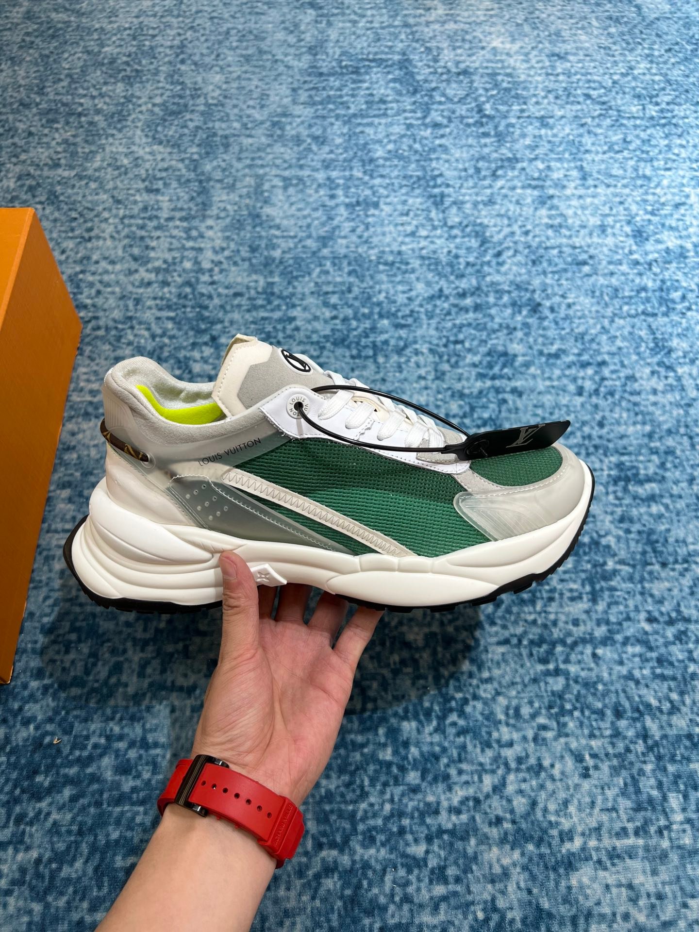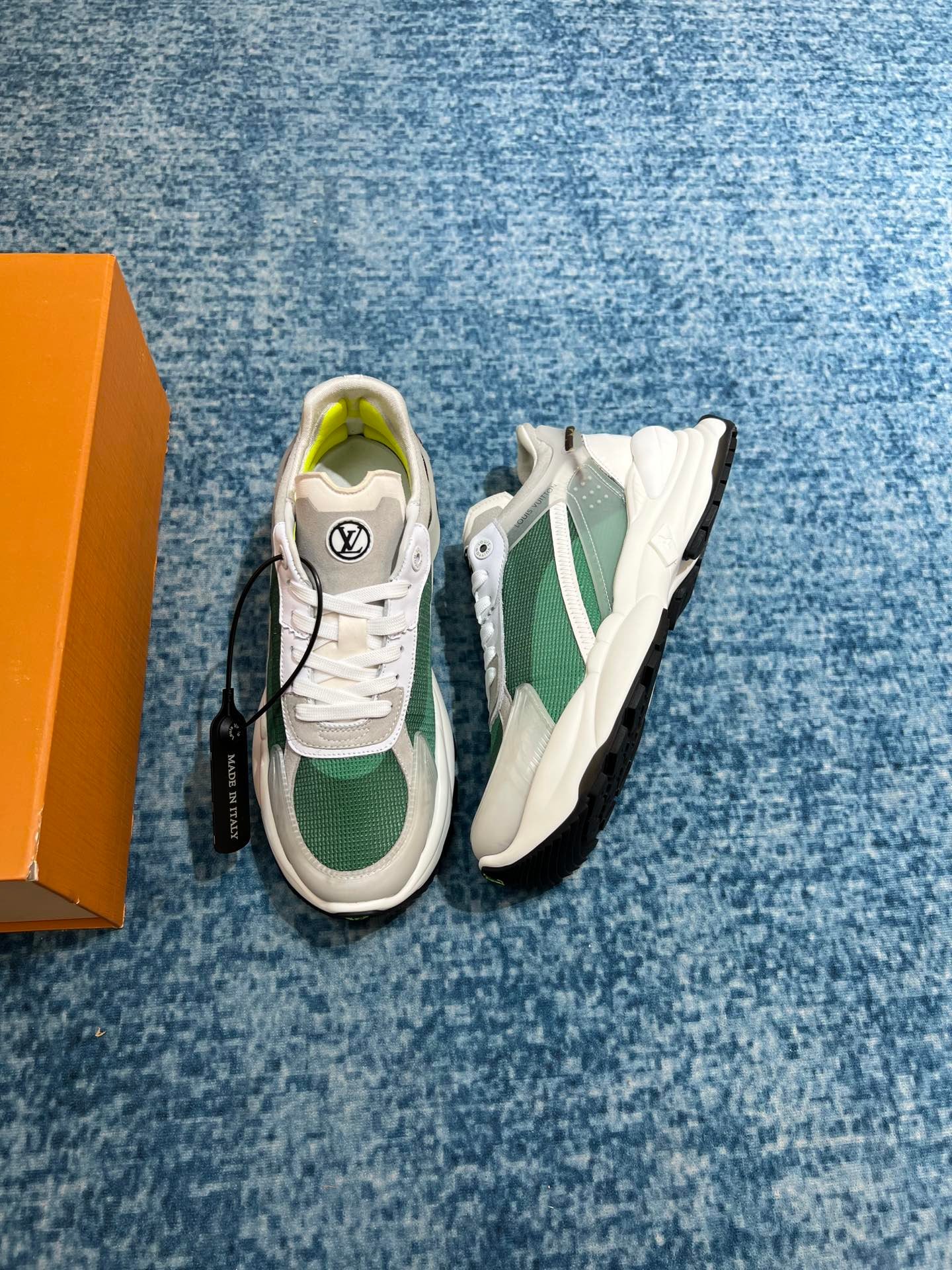 Run 55 运动鞋的灵感来自于赛车服,其特点是其凸起的橡胶外底,提供最佳的舒适度和弹力。该版本采用科技网布等多种材料制成,金属金色饰边平衡了运动美感。该款式以其许多标志性细节而闻名,包括背面的 Monogram 帆布带子。