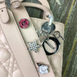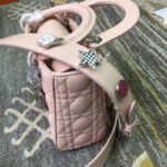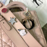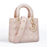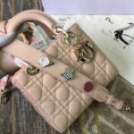 - 结构:“Lady Dior”浅粉红色小羊皮手提包“Cannage”藤格纹缝线装饰淡金色配饰可调节肩背带,可以Lucky Badges幸运徽章作个性化装饰可手提亦可肩背或斜挎