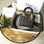 - 结构:Lady Dior黑色小牛皮柔软手提包,缀以饰钉Cannage经典藤格纹图案“D.I.O.R”吊饰复古金色金属配饰宽肩背带斜挎与手提两用