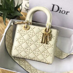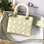 - 结构:Lady Dior原色小牛皮柔软手提包,缀以饰钉Cannage经典藤格纹图案“D.I.O.R”吊饰复古金色金属配饰宽肩背带斜挎与手提两用